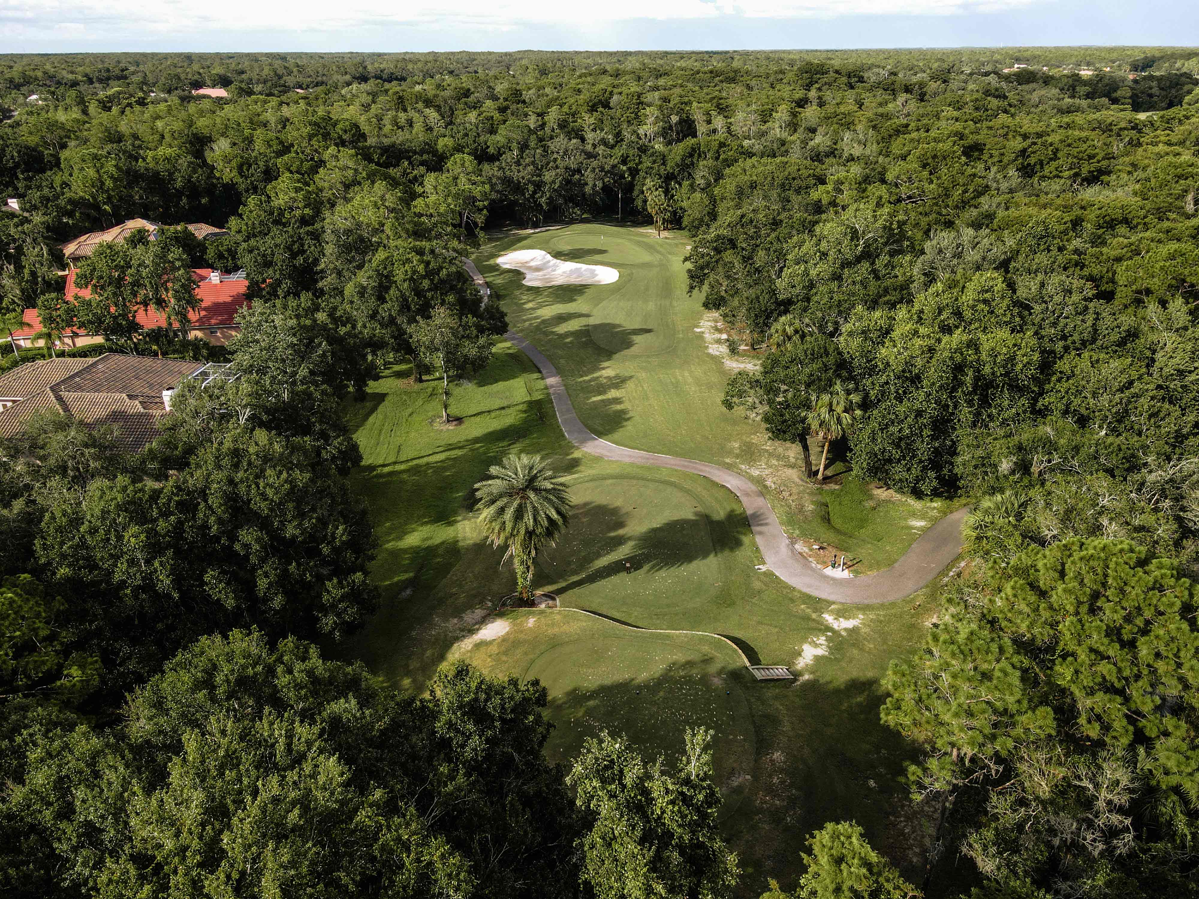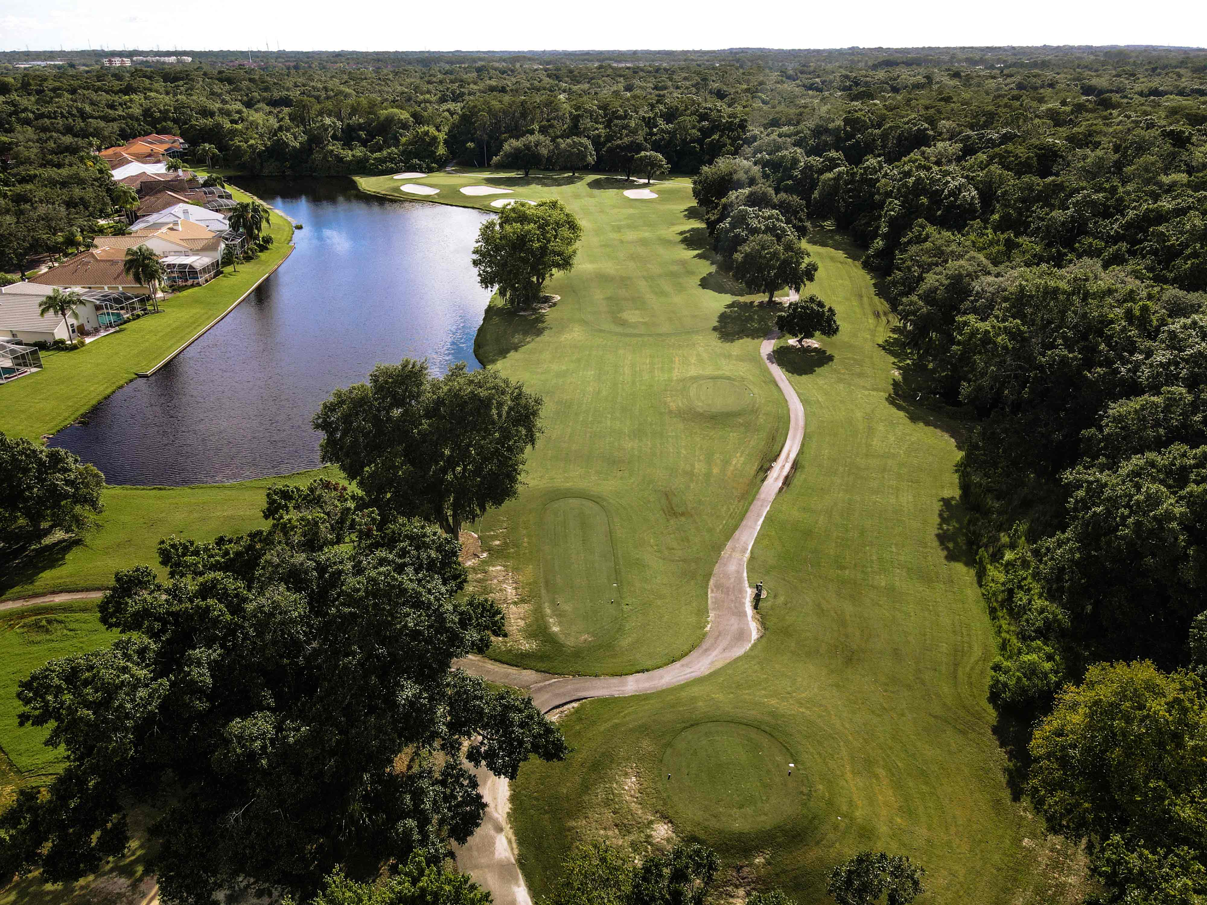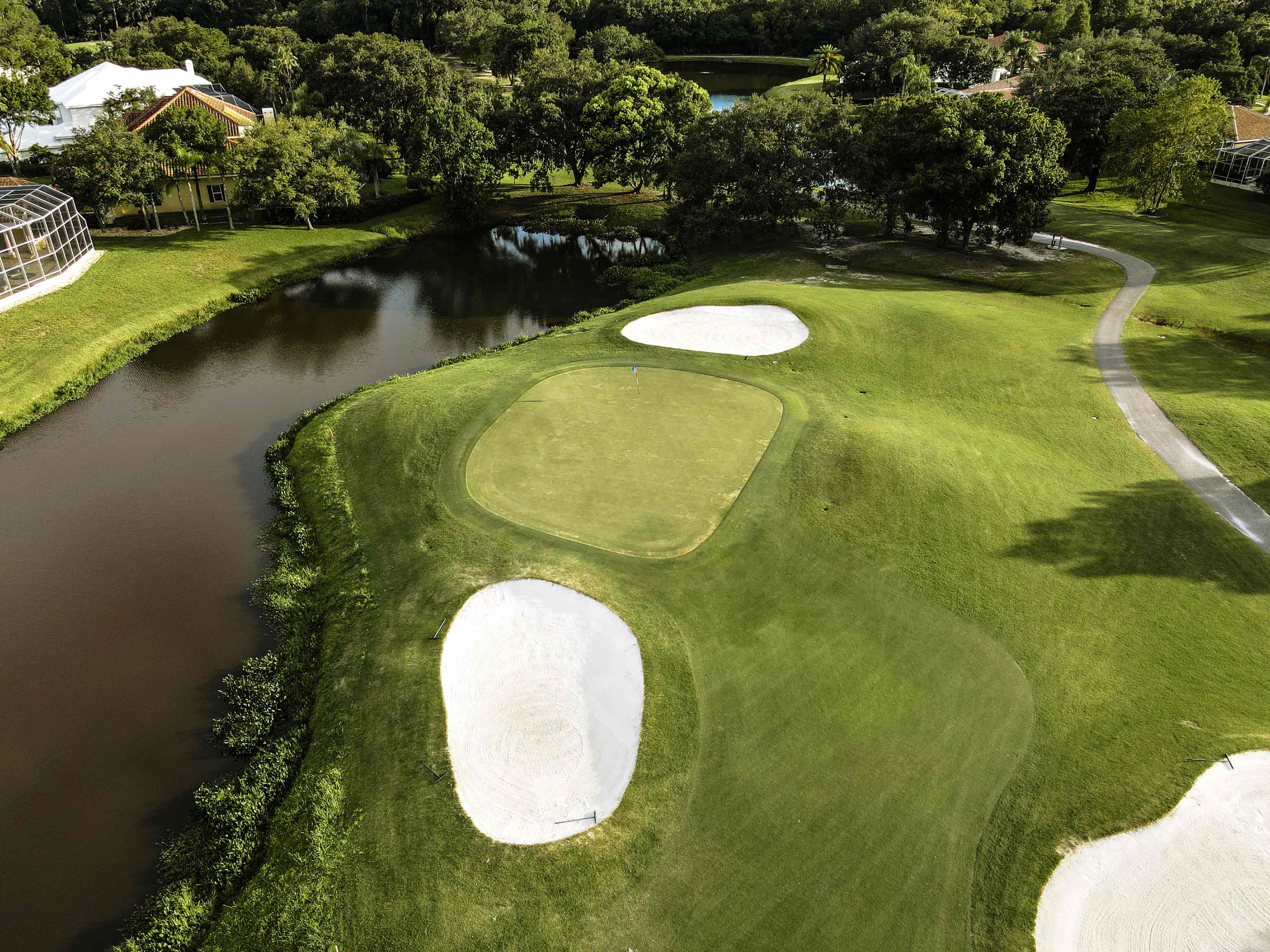 | Signature hole, three shot par 5, important to miss the fairway bunkers, water and bunkers guard the green |
