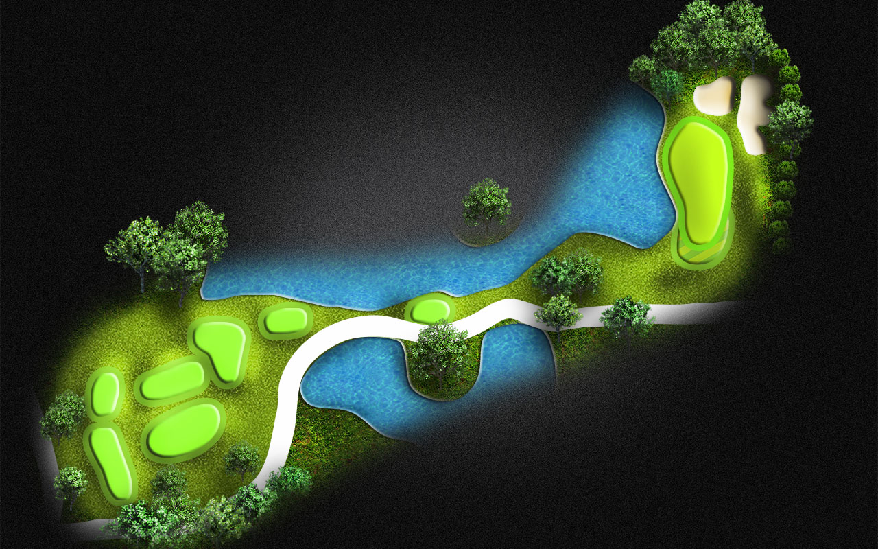 A demanding tee shot between 2 waters still leaves you a tough mid iron to the green surrounded by water on both sides. Drive it to the 150 yard marker gets you started on the last hole of the day.
