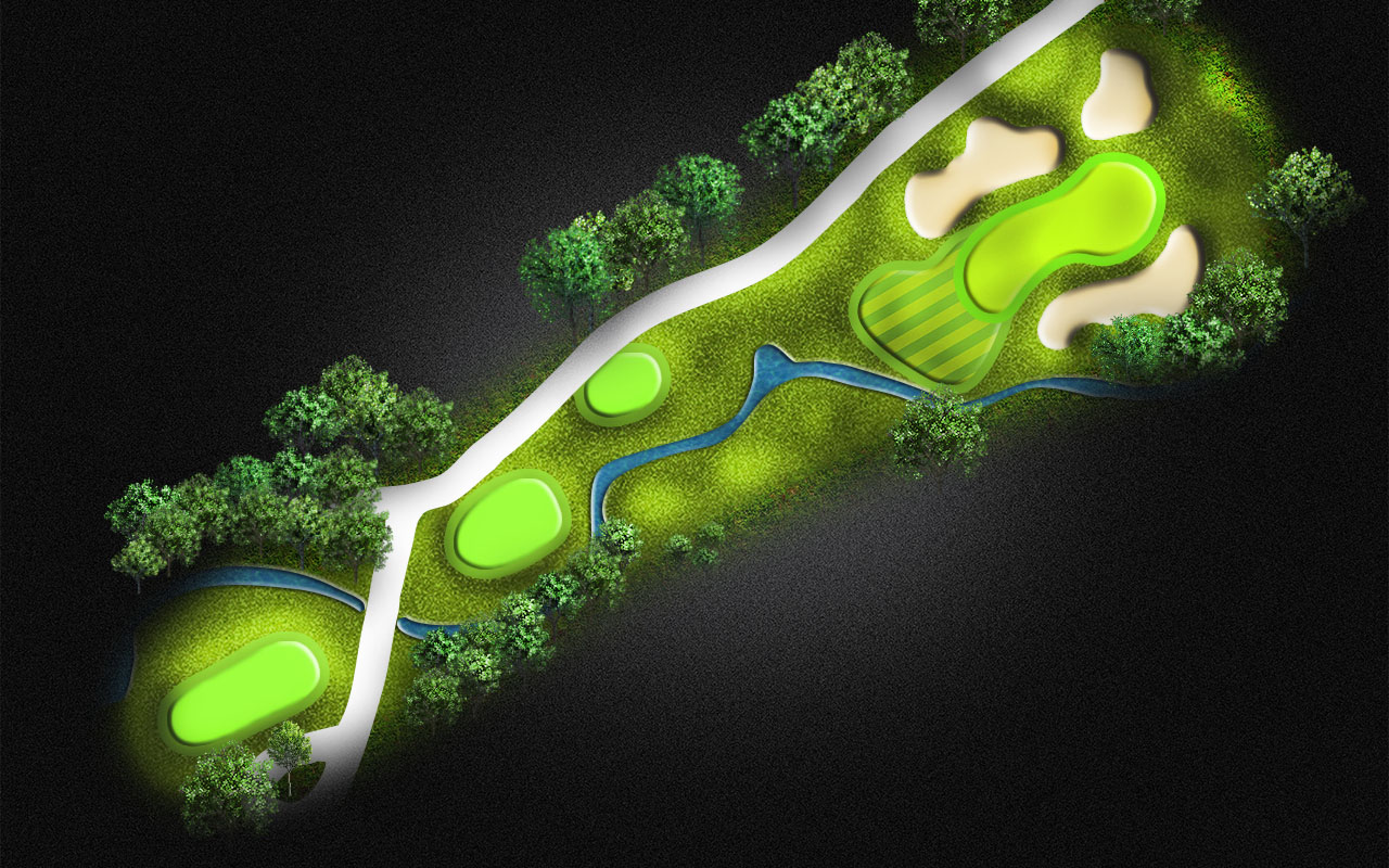 You cant see the water crossing the fairway from this tee on the Par 5. Play a precision drive and you may be able to reach this green in 2 with the downwind elements.