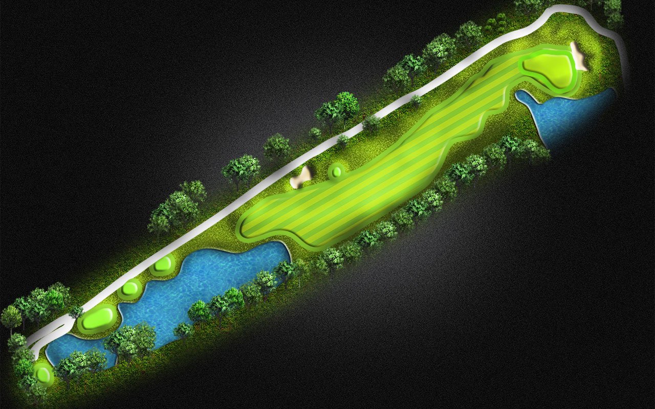 A demanding tee shot on the Par 5 is crucial. You must lay up between the water on the right and left. Long hitters will have a chance to get to the green in 2.