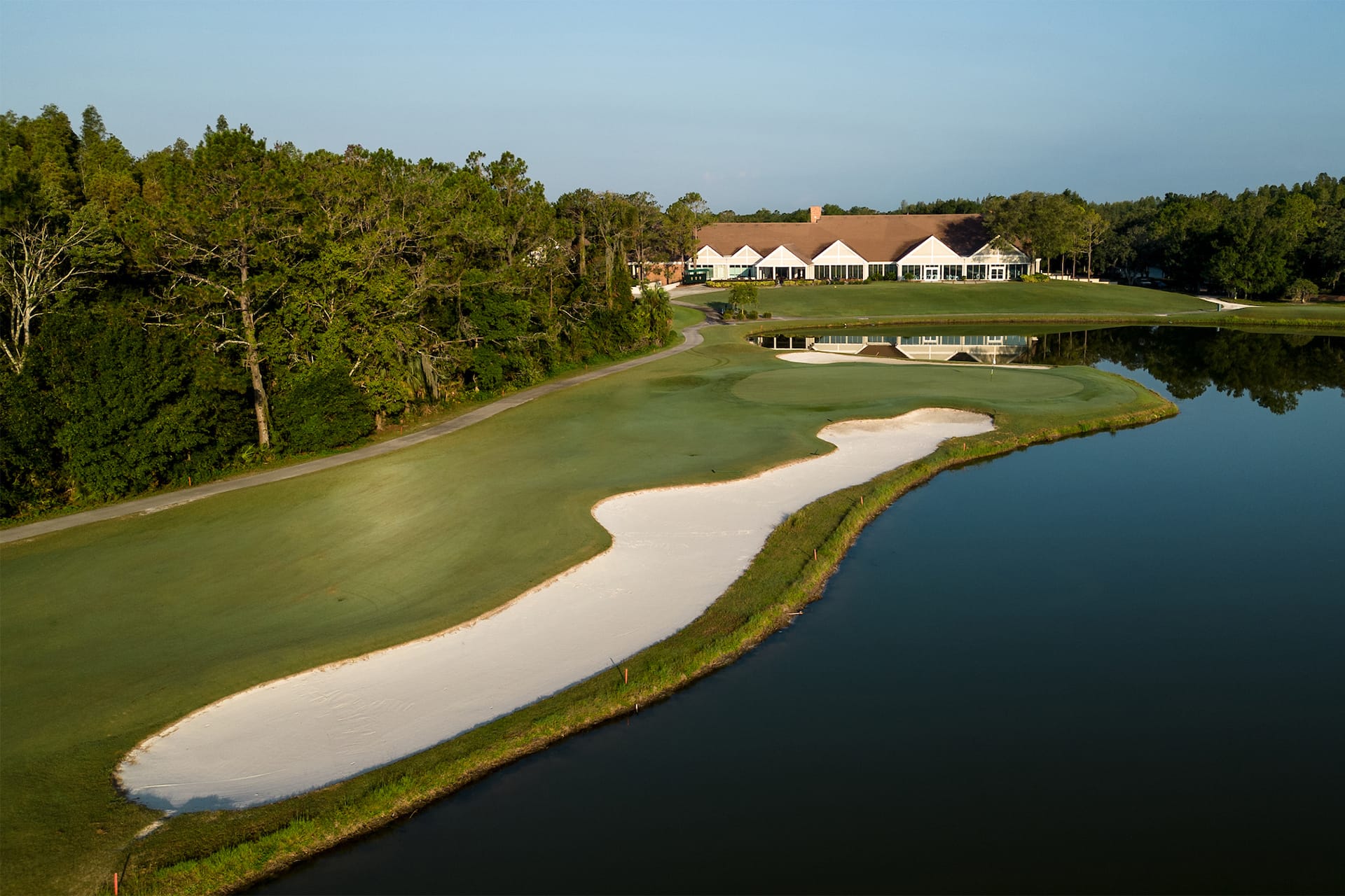 Nestled in lush Florida, Tom Fazio's golf course suits all skill levels. Carved from wetlands and pine forests, it features manicured tees, fairways leading to challenging TifEagle greens. Unlike typical Florida courses, sand bunkers, not water hazards, add challenge for a unique golfing experience. Noteworthy holes like the par-3 4th and par-4 6th contribute to a fair yet challenging adventure, culminating in the signature par-4 18th hole with its water-lined fairway and breathtaking views of the clubhouse from the final green.