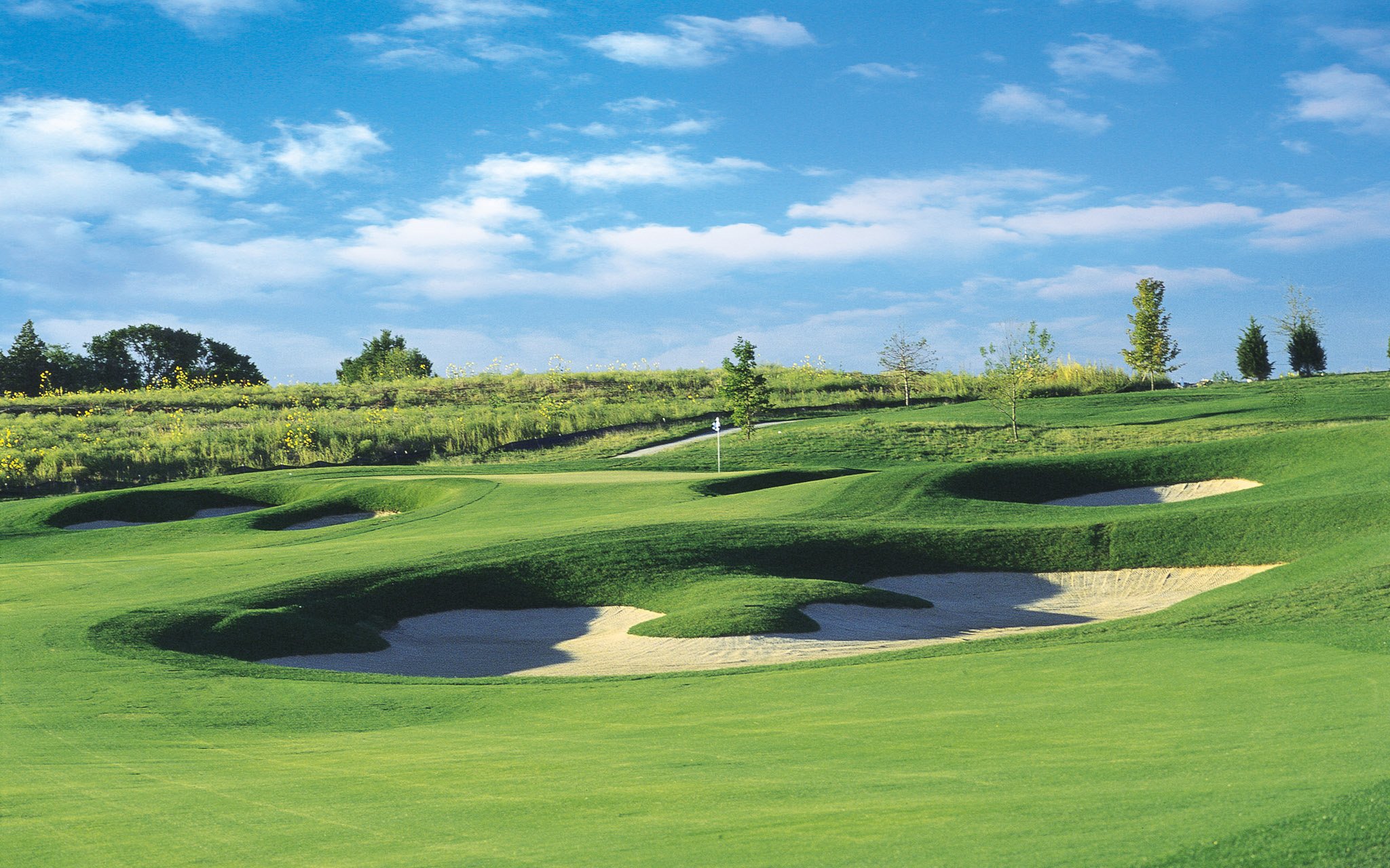 Both sides of the course end with par fours of similar length, running alongside each other back to the clubhouse. The ninth hole uses a pair of fairways to make reaching in regulation difficult while the 18th hole uses a line of fairway bunkers to dare players to bite off as much as they think they can chew if they want a birdie putt.