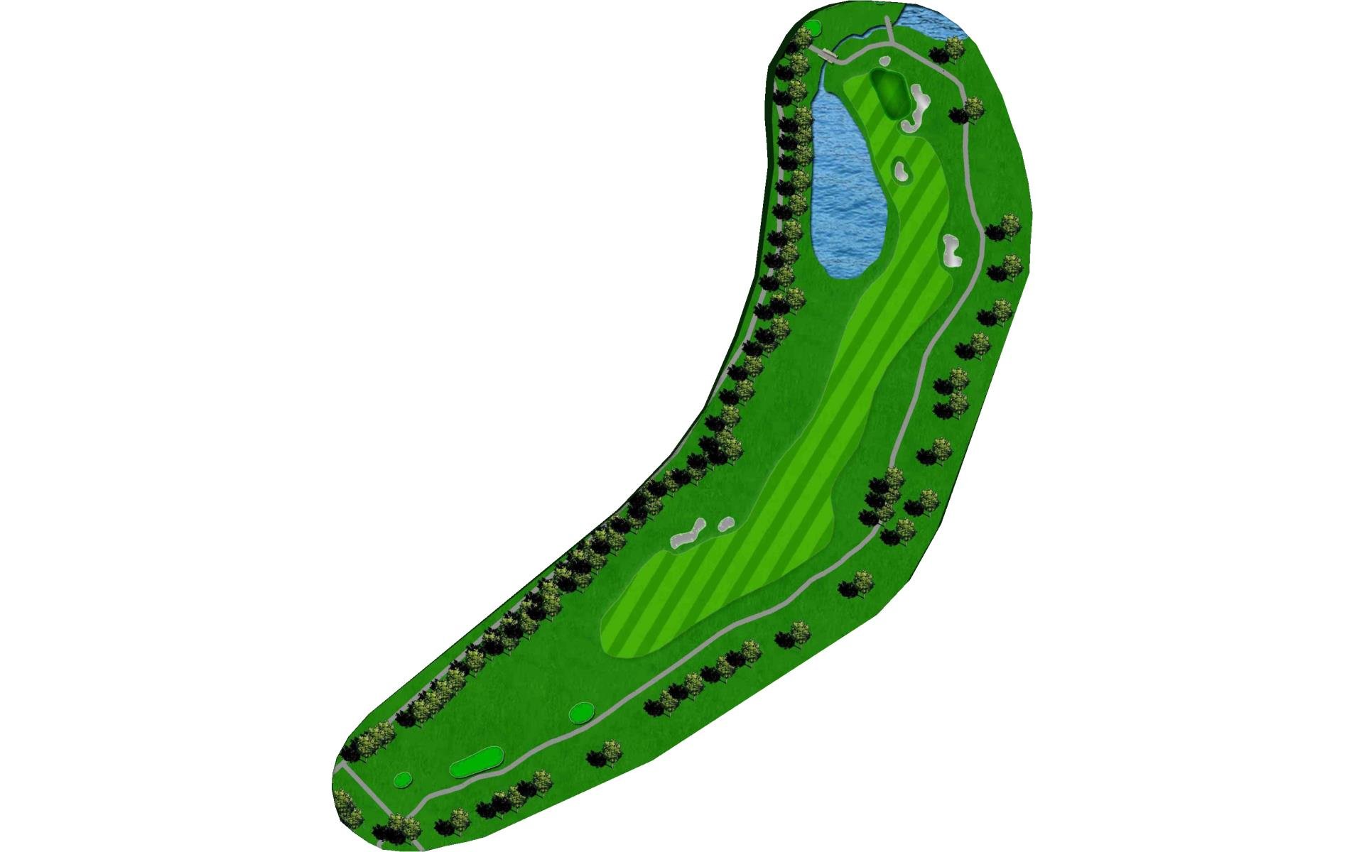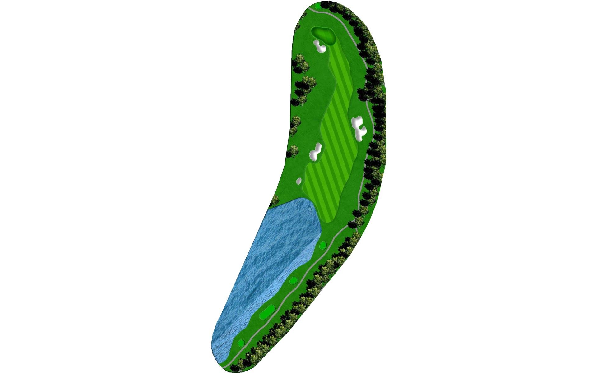 | This long dogleg left par 4 requires players to carry the water on their drive to a landing area flanked by fairway bunkers. The approach shot must avoid the large greenside bunker on the left. |