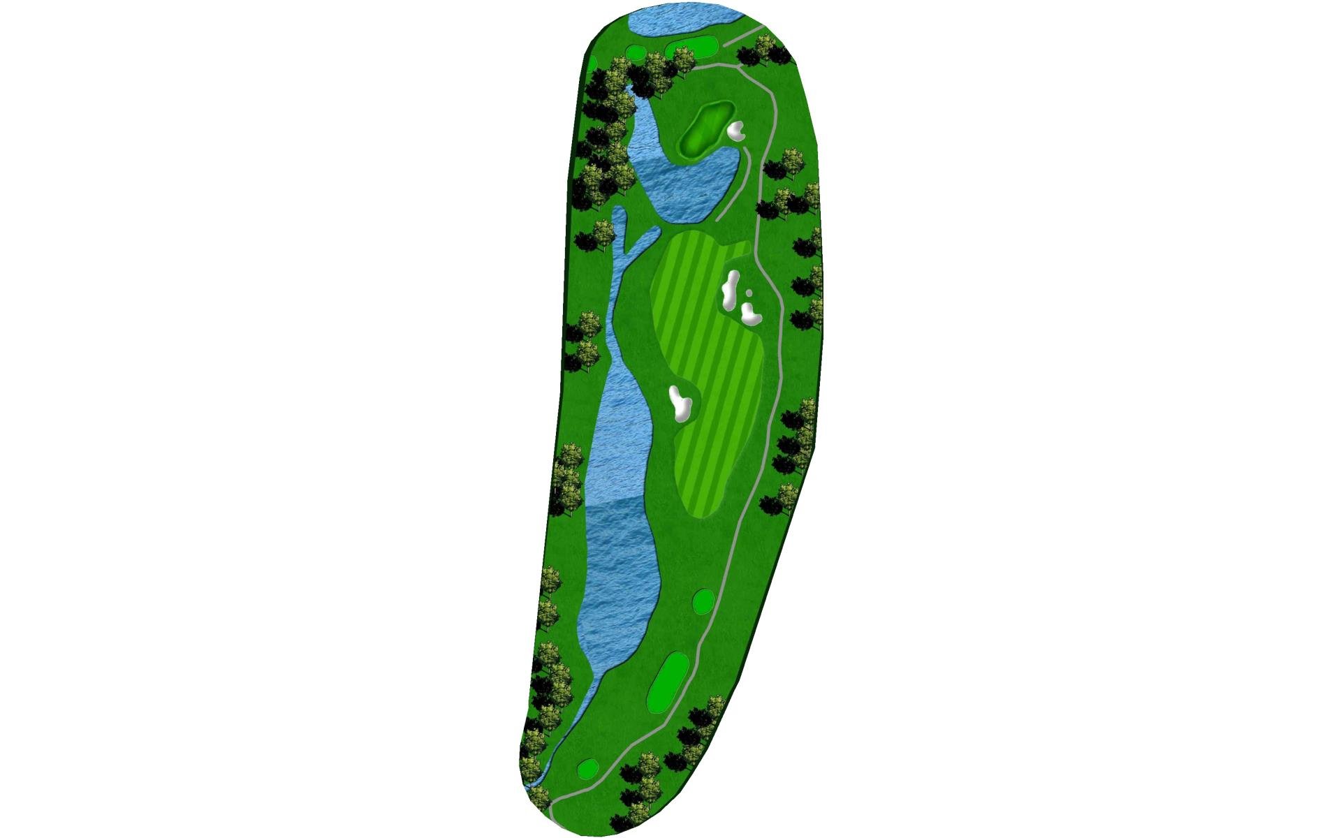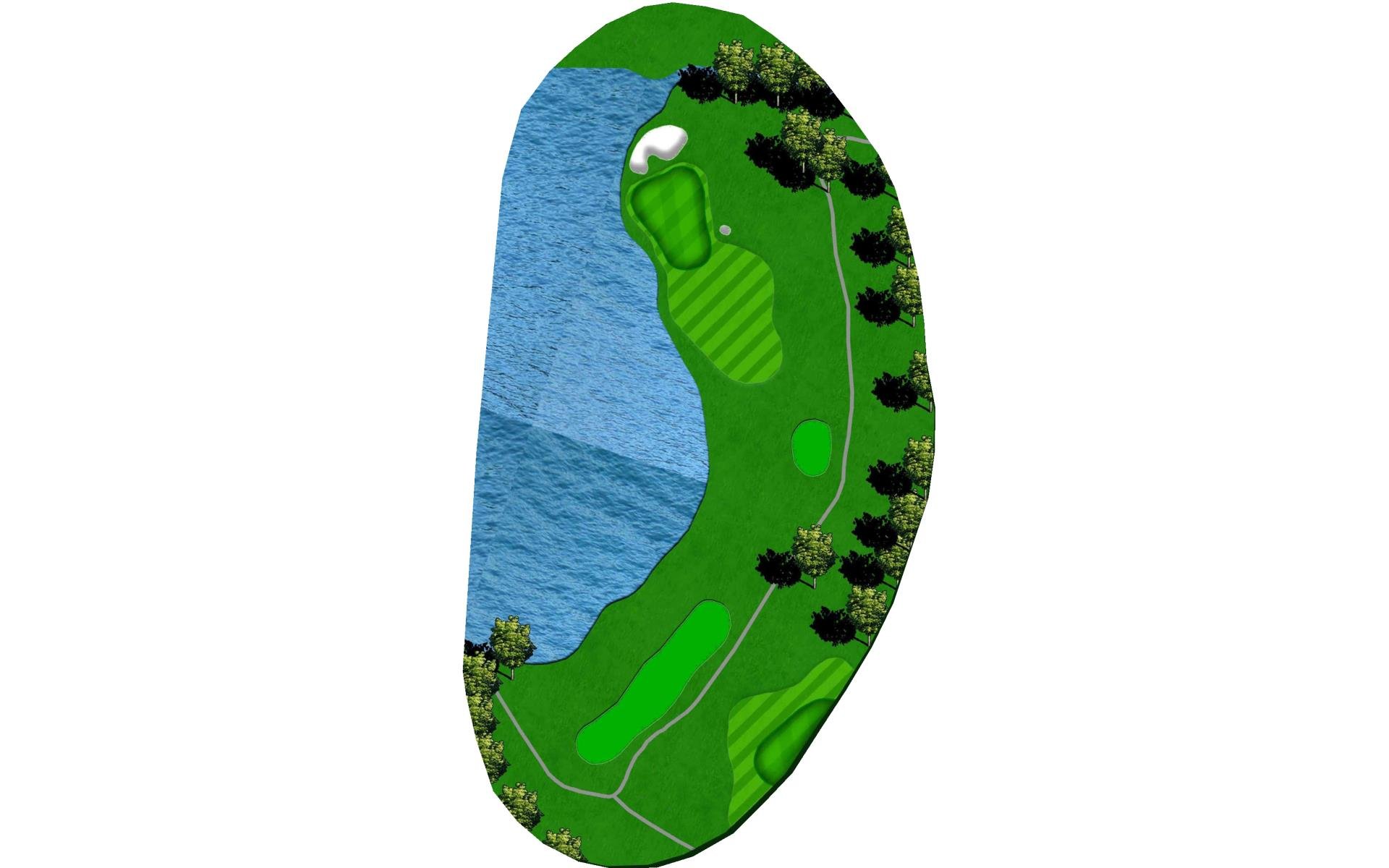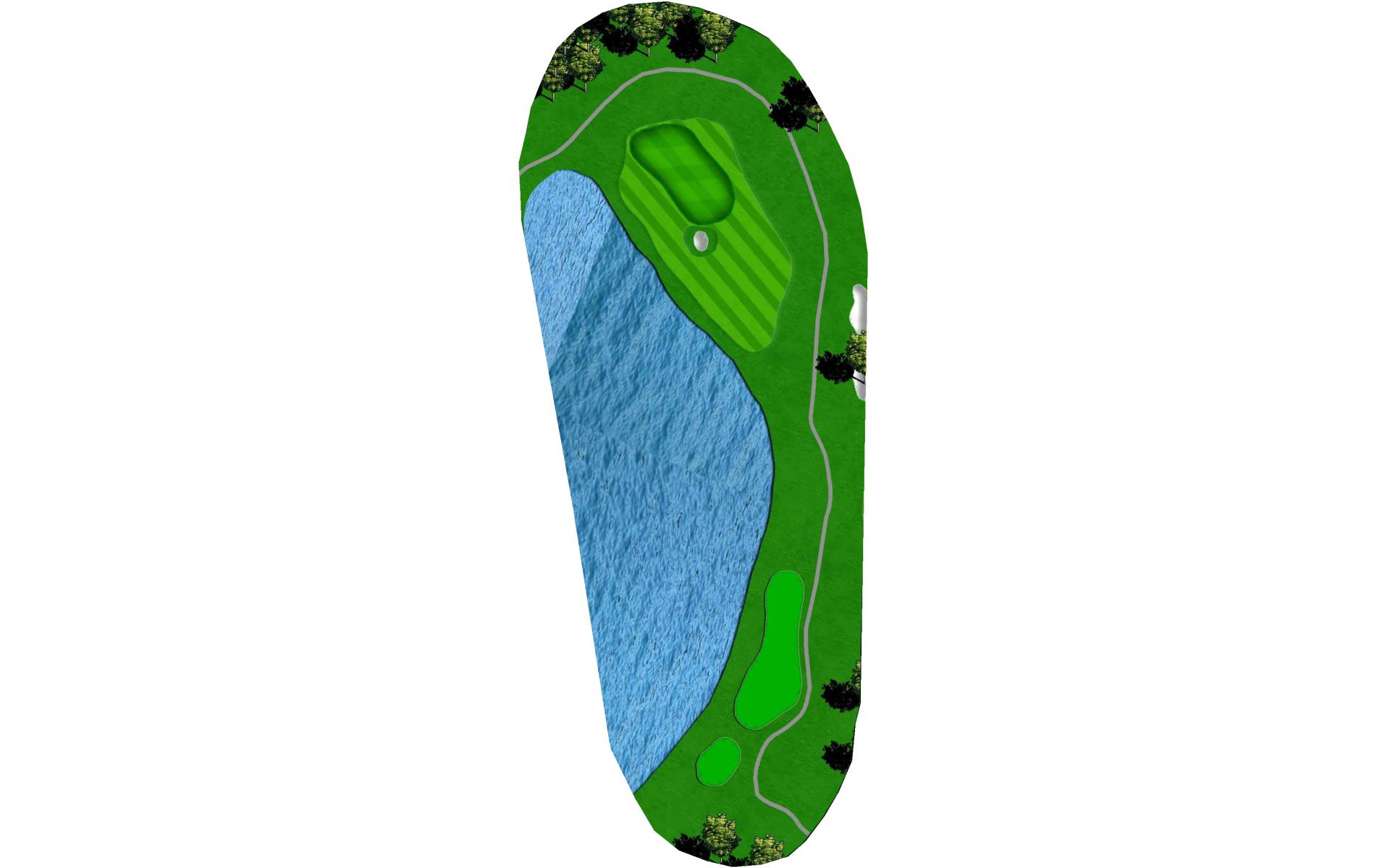 | The green on this strong par 3 features three-tiers and is protected in front by water and a small pot bunker on the front-right edge. A swale at the center of the green will feed balls down to a lower fairway next to the water. |