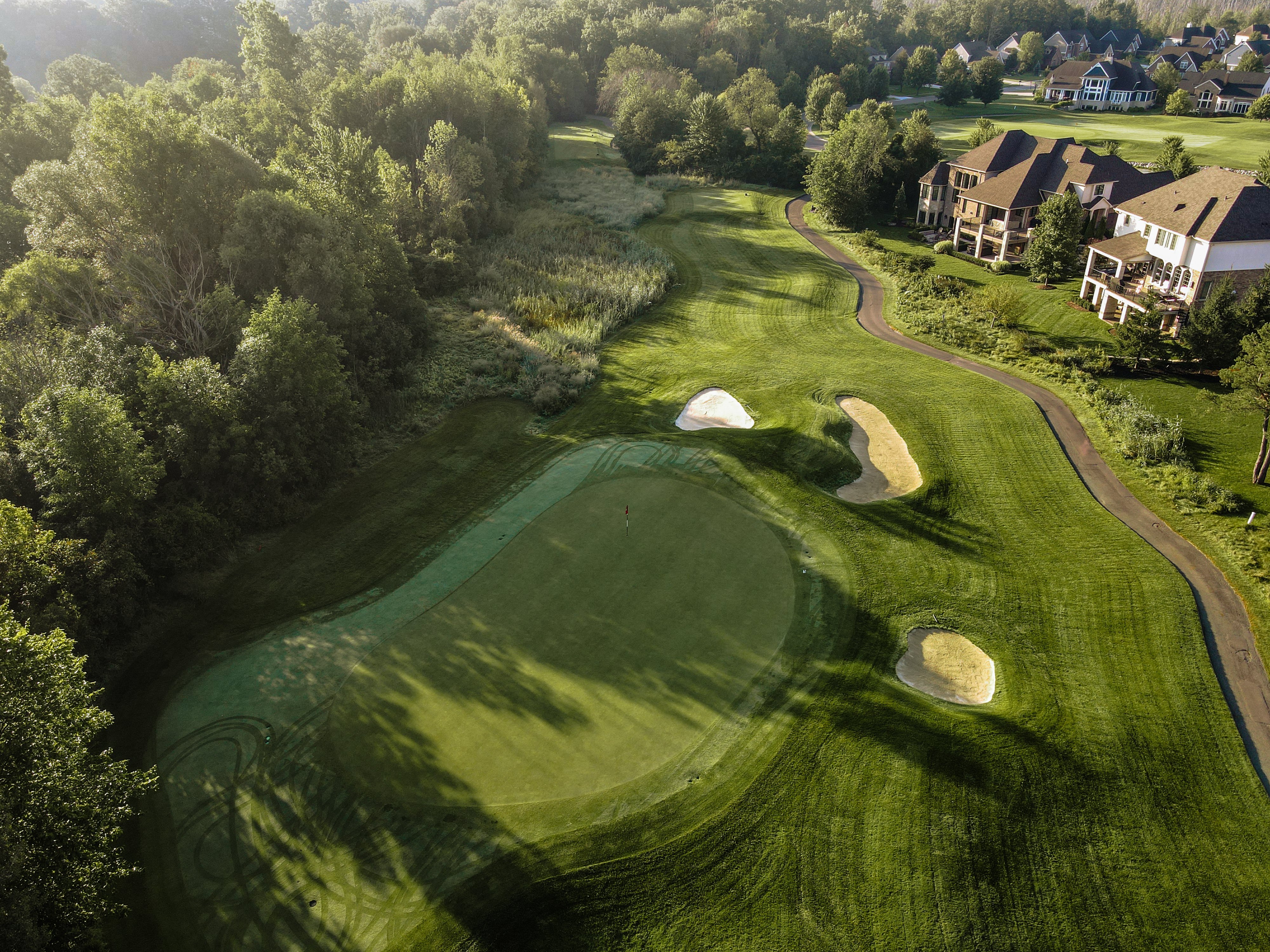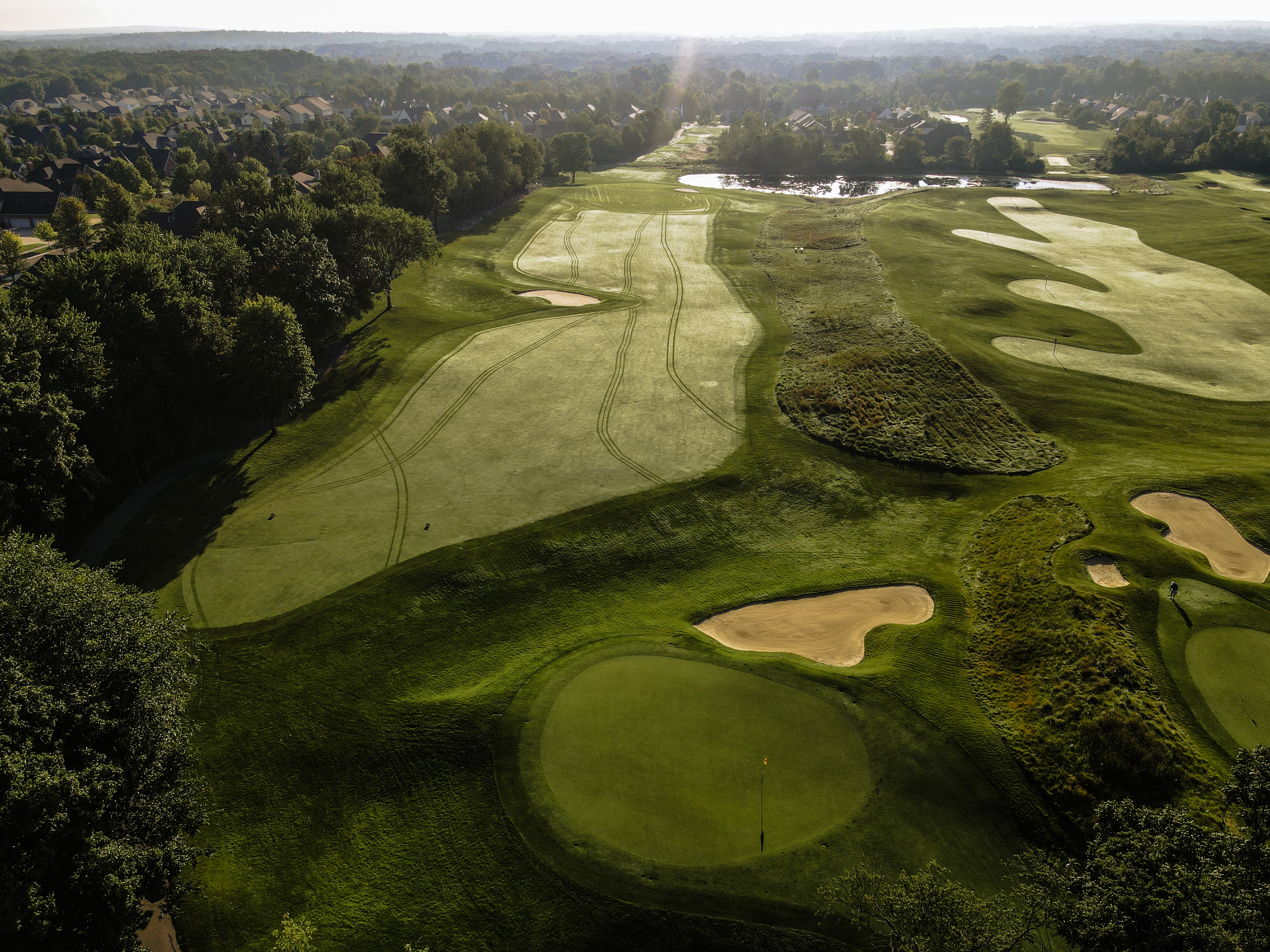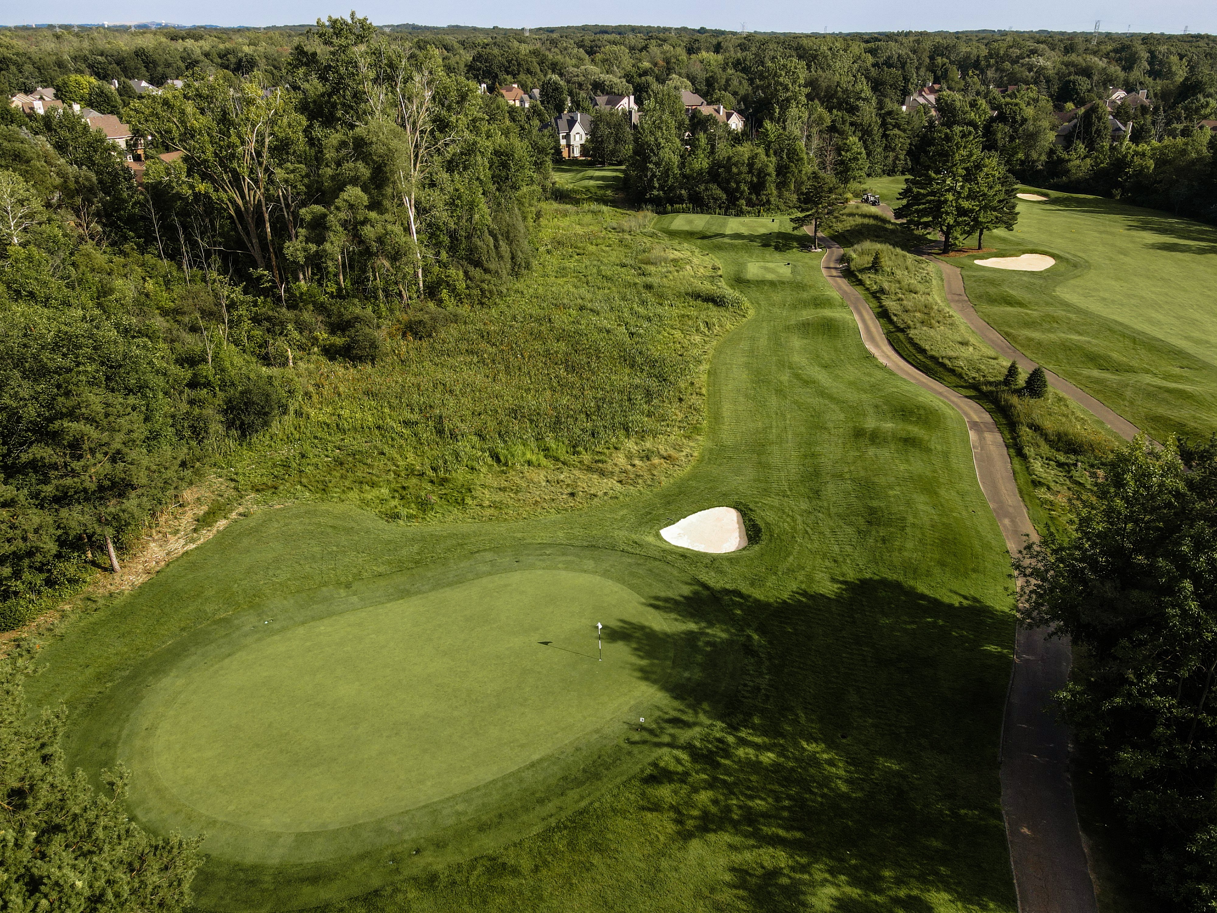 A long fade drive just over the right side of the large oak on the left will run down the hill. Too far right brings back yard unplayable out of bounds into threat. Without a crushing second shot the smart play is a lay-up just beyond the rock ridges for a short iron into a wide, shallow green. A significant landing beyond the marsh in front of the green is hidden from view. Long and over the green will probably be gone. The green slopes more left to right but also slopes back to front.