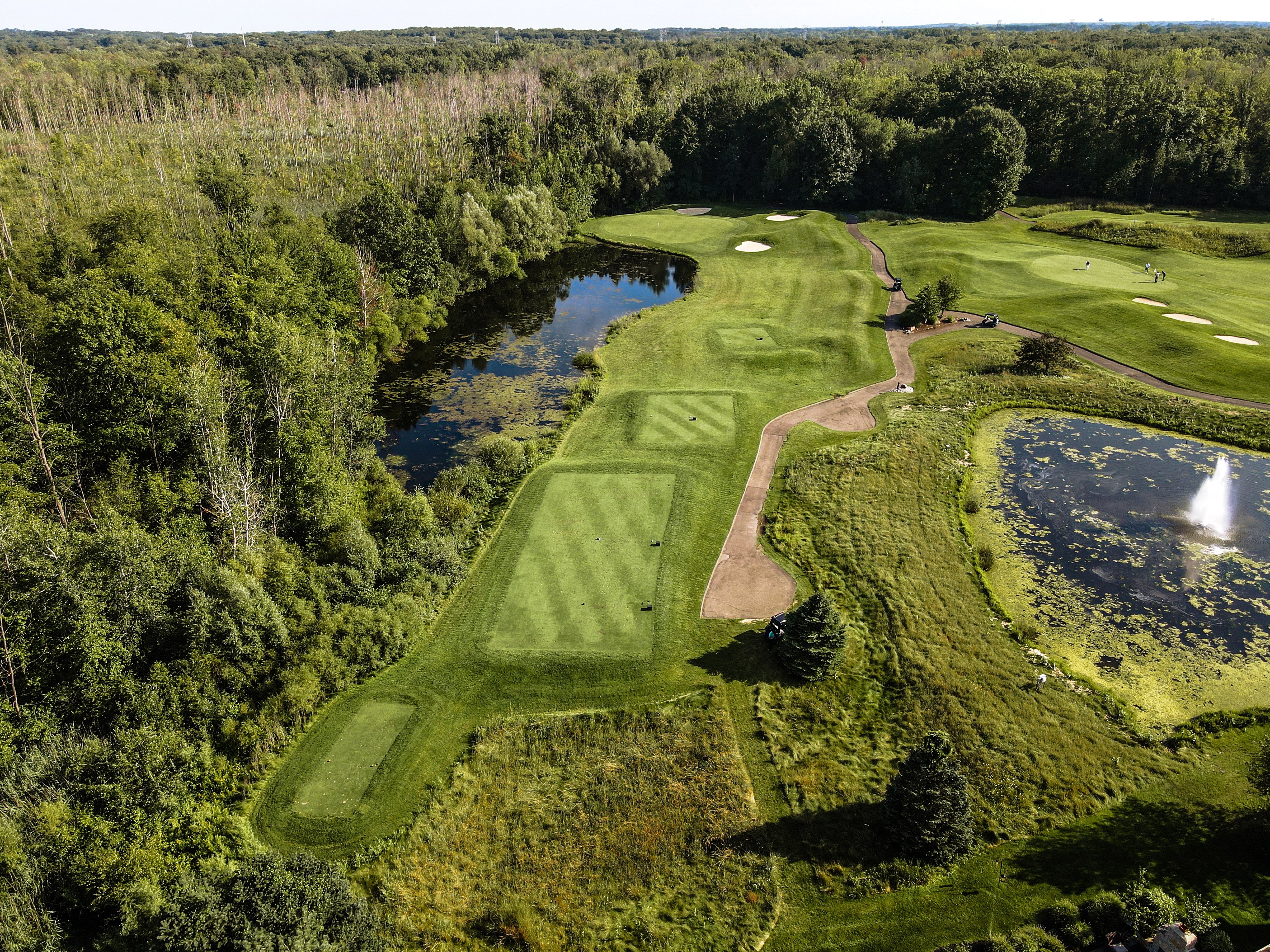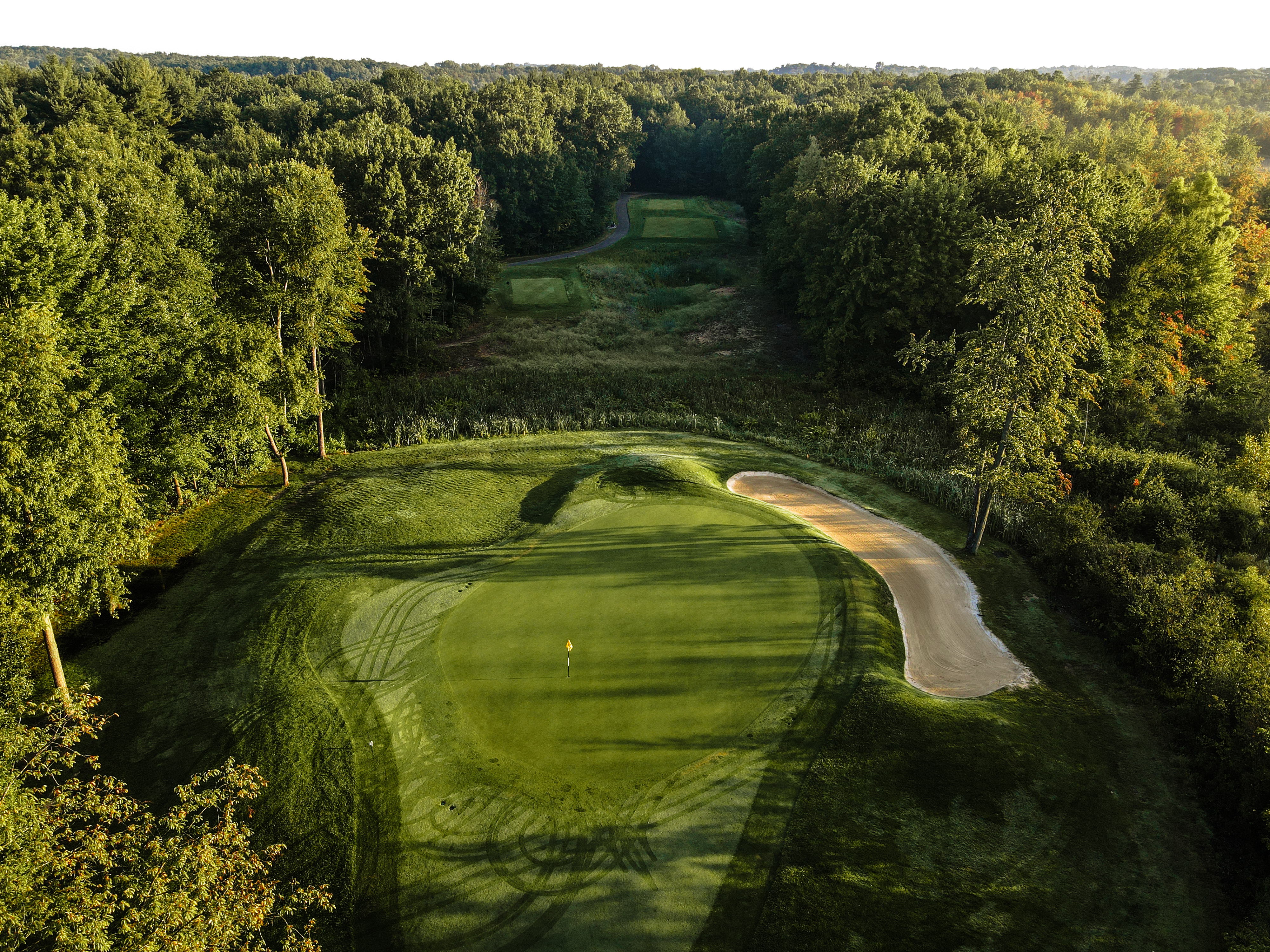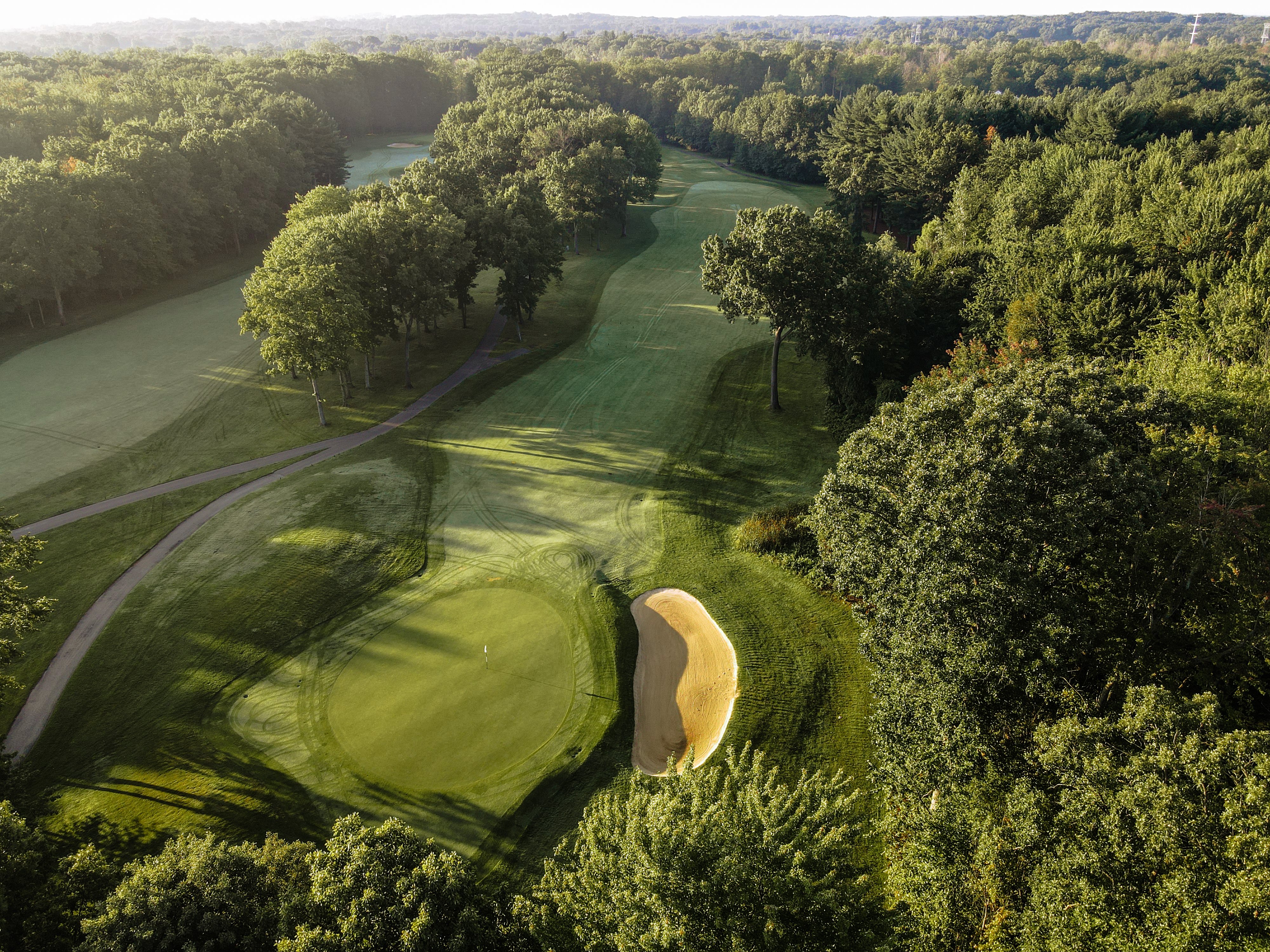 The gap between the last tree on the left and the wide sand bunker in the center of the hole begs for a 210-yard carry to the 150-yard stake, leaving a second shot over a deep, hidden grass bunker and a deep pot sand bunker on the right front corner of this small, right to left sloping green. A long carry straight ahead will put you perfectly placed with a 150-yard straight carry into the flag. A large landing area sits behind and left of the green.