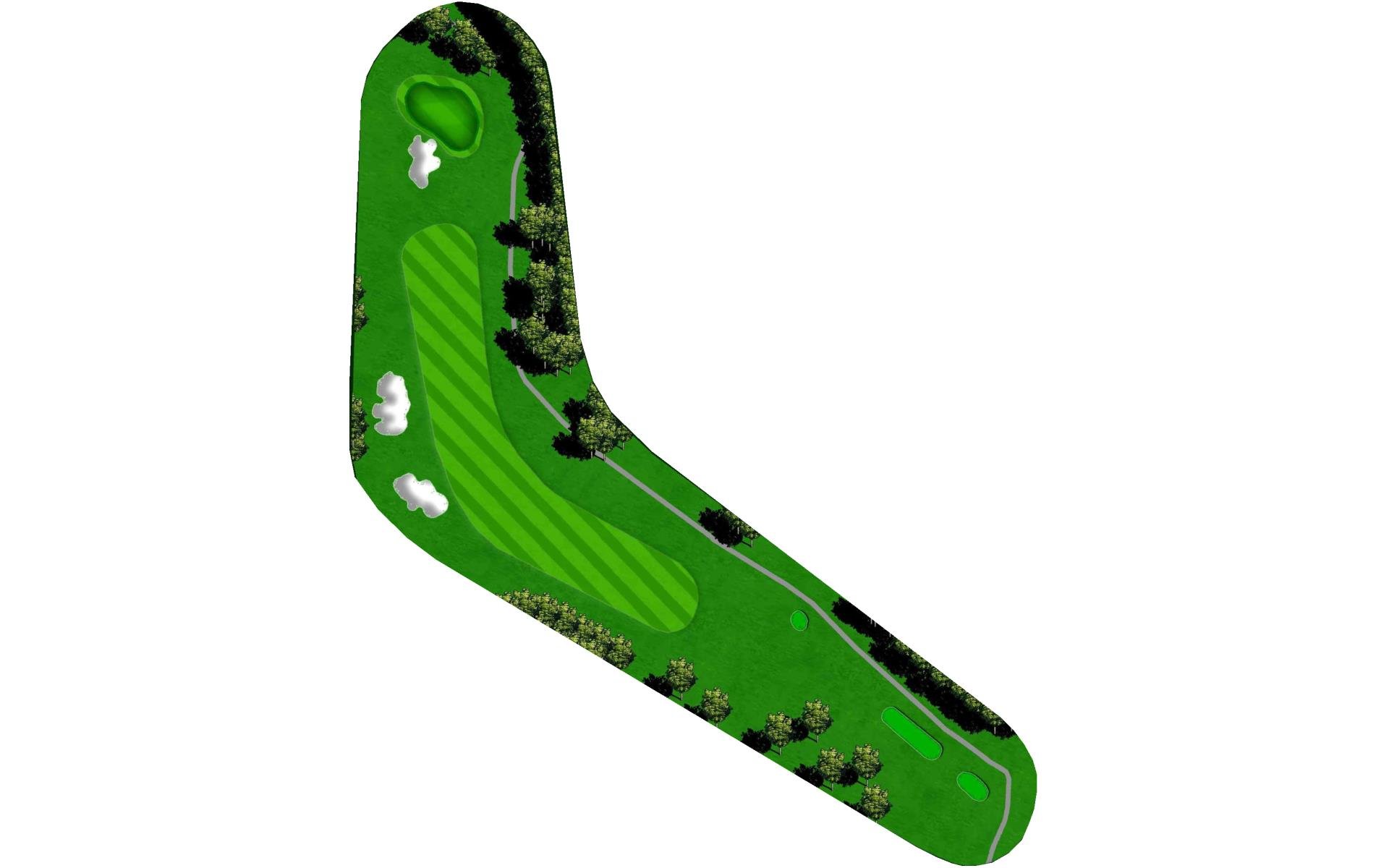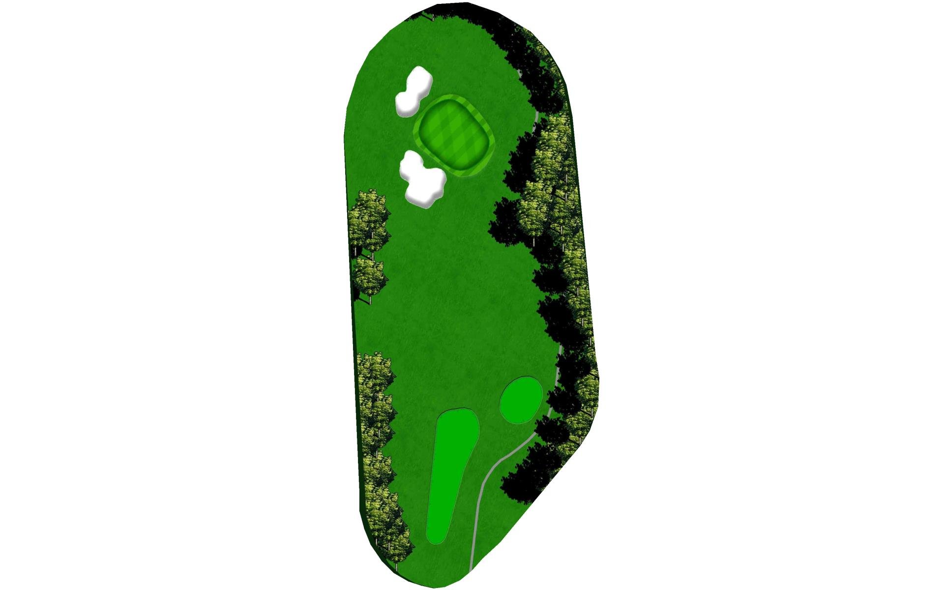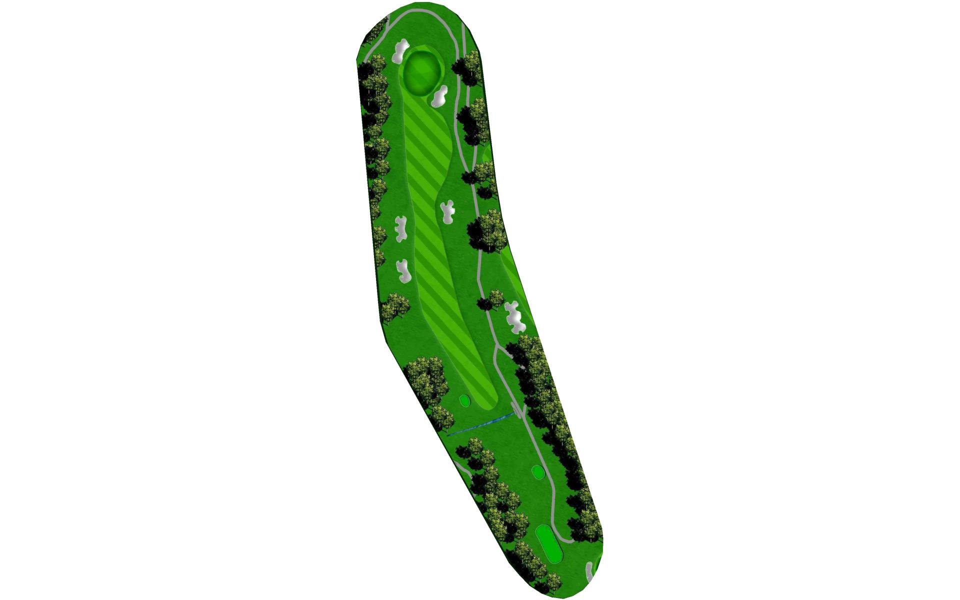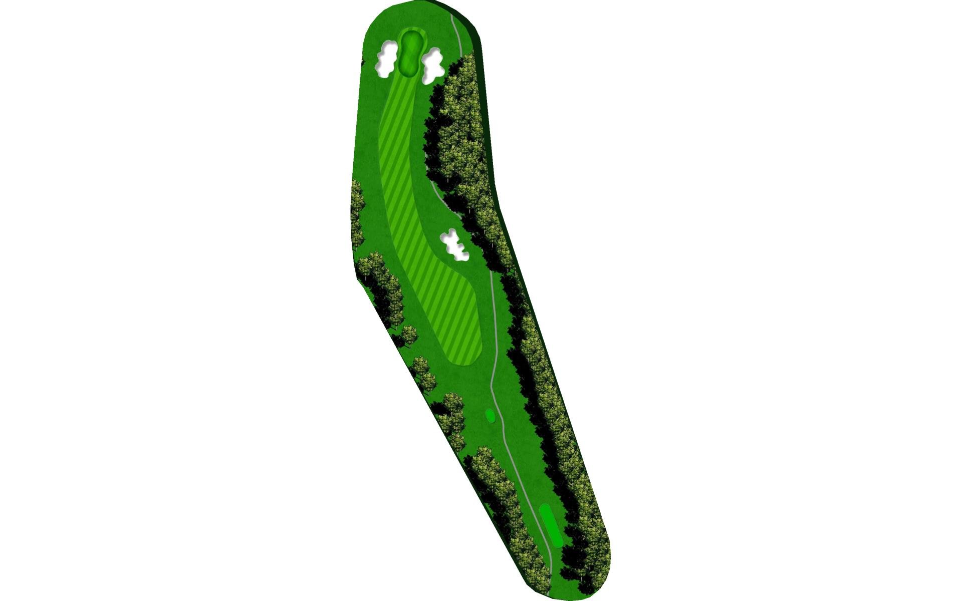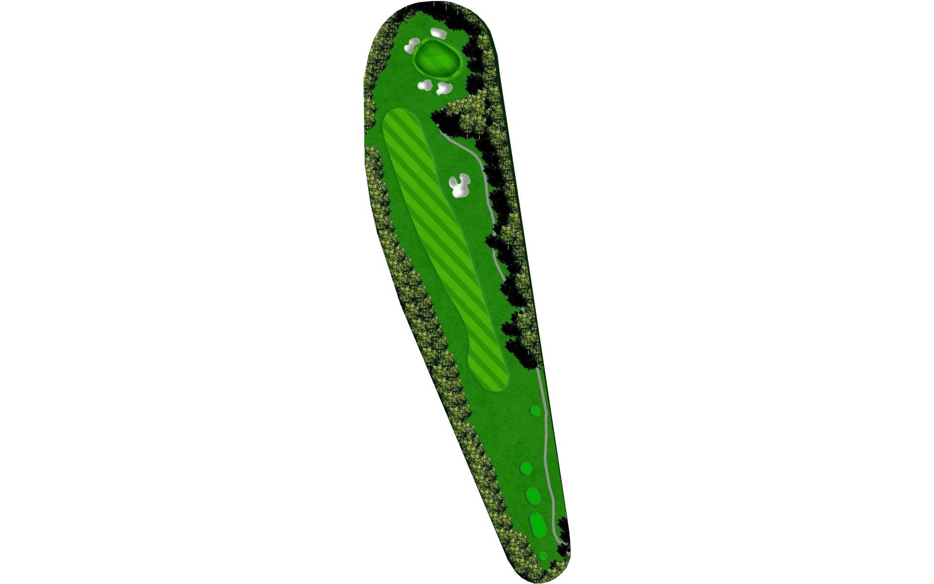 Dogleg right Par 4 with out-of-bounds left and a wooded penalty area on the right. The green complex has three distinct tiers which slope from back to front.