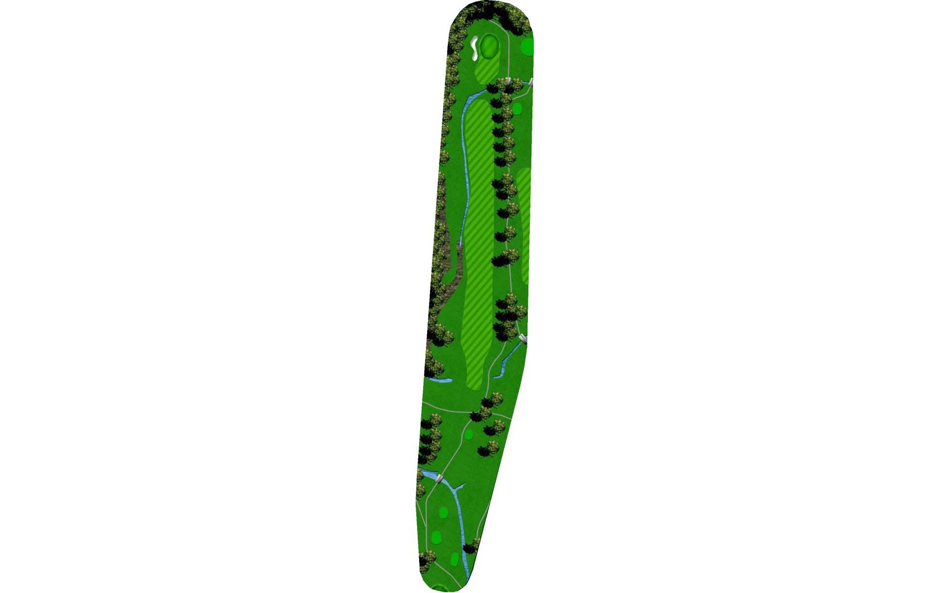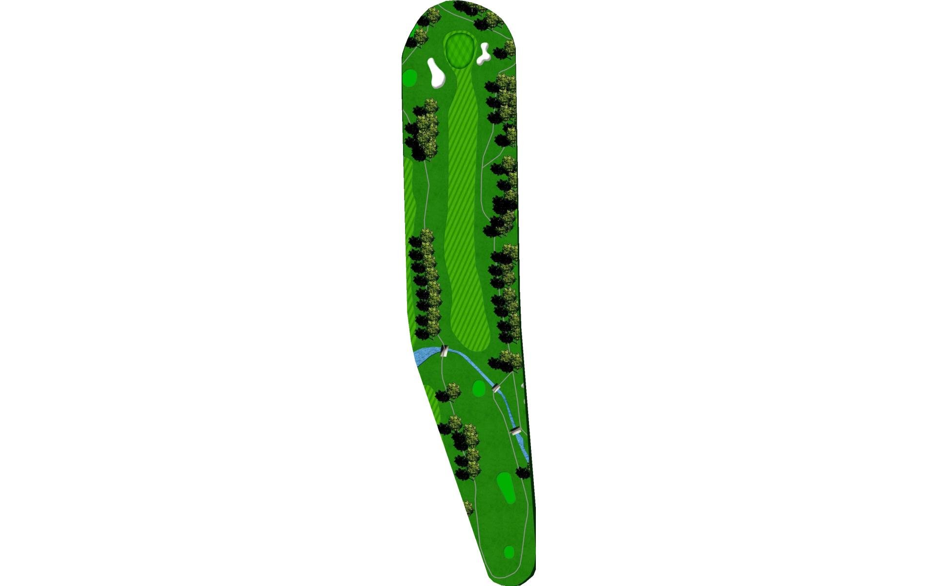 Difficult tee shot with water on right and crossing the fairway. Mostly a three-shot hole. Difficult approach shot to a narrow green that is slightly elevated.