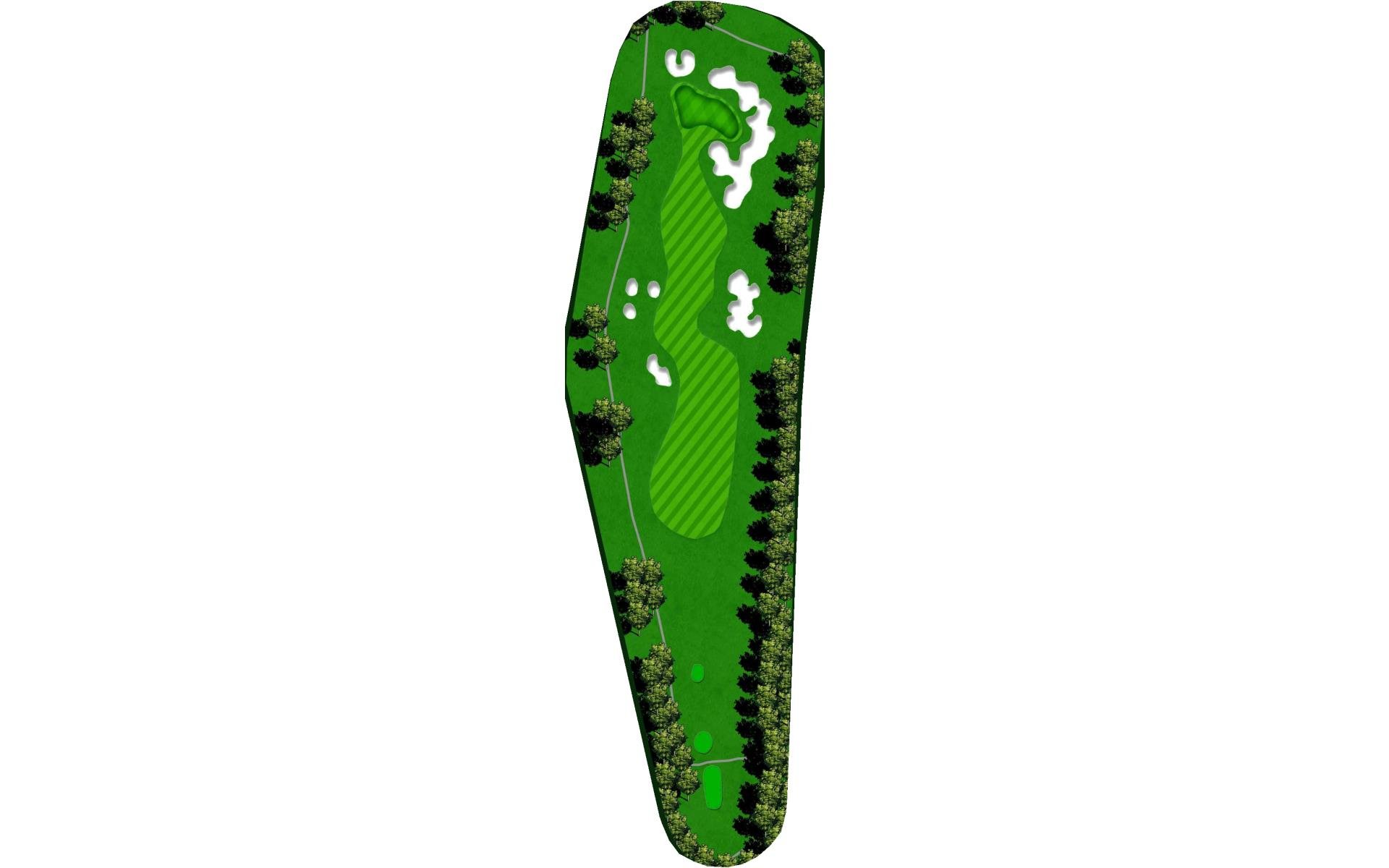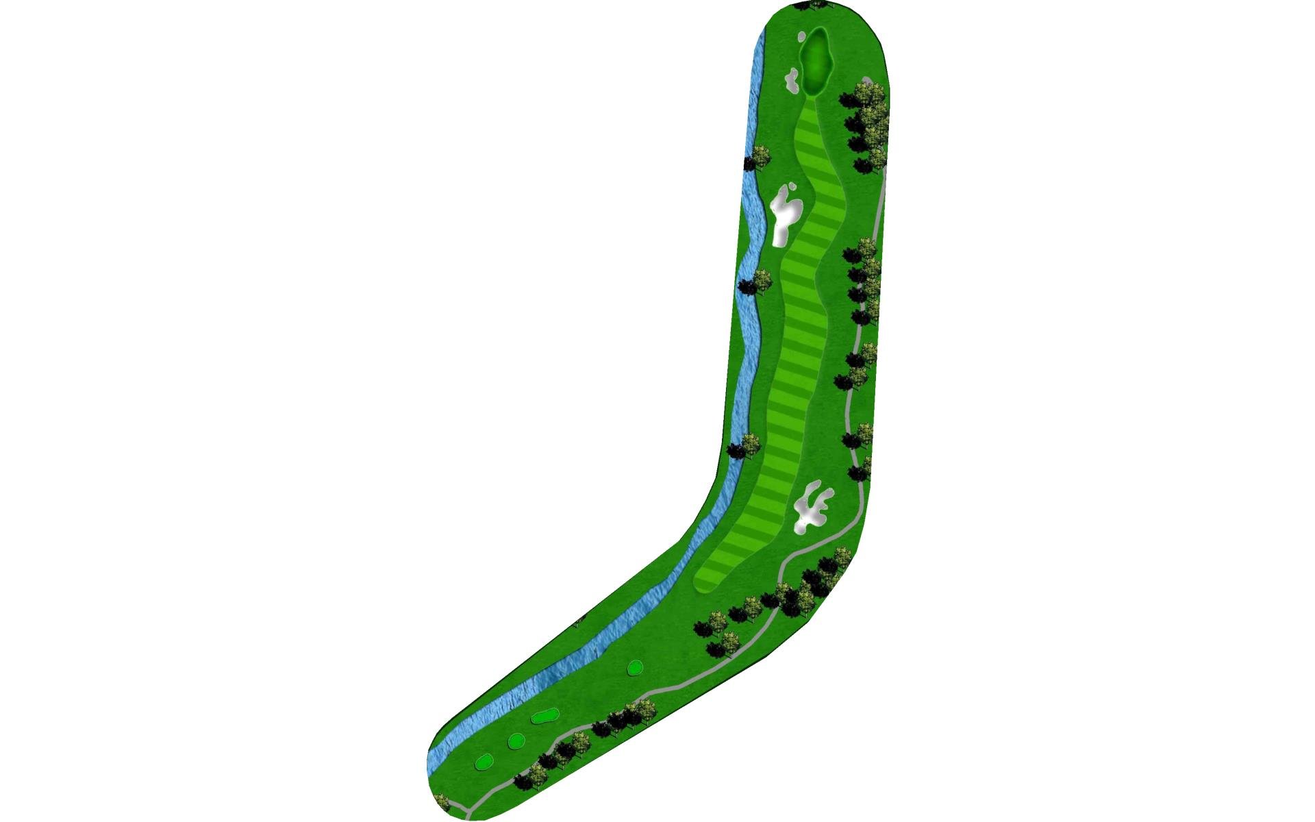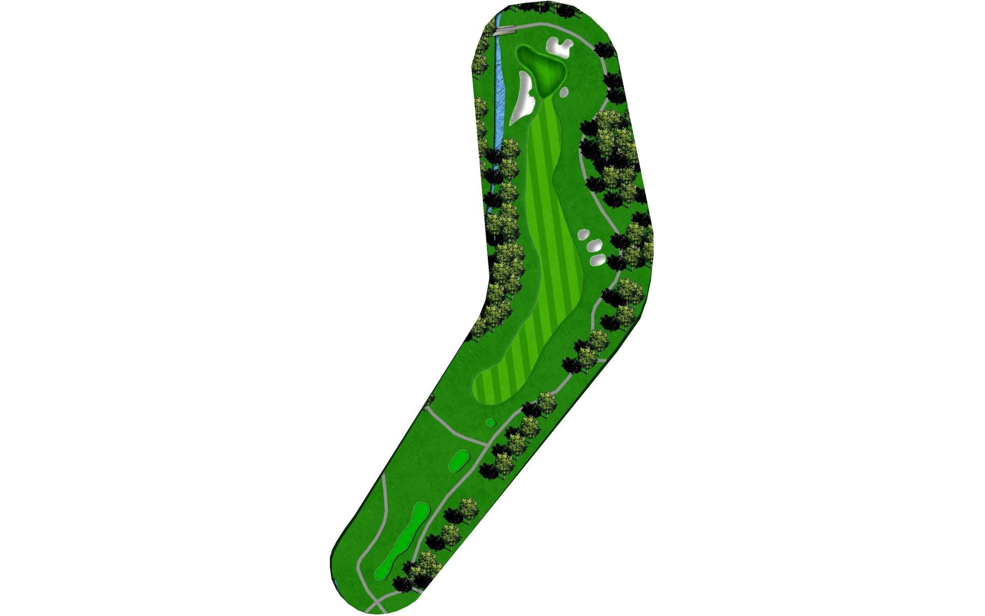 Long par 5. Driver or 3 metal off the tee is the play on this long Par 5. A pond about 270 yards out comes into play with any tee shots that miss the fairway on the right side. Another pond begins on the left side of the fairway roughly 200 yards away from the green and wraps around the left side to the back of the green. Layups must be positioned correctly as water comes into play on both your 2nd and 3rd shots.