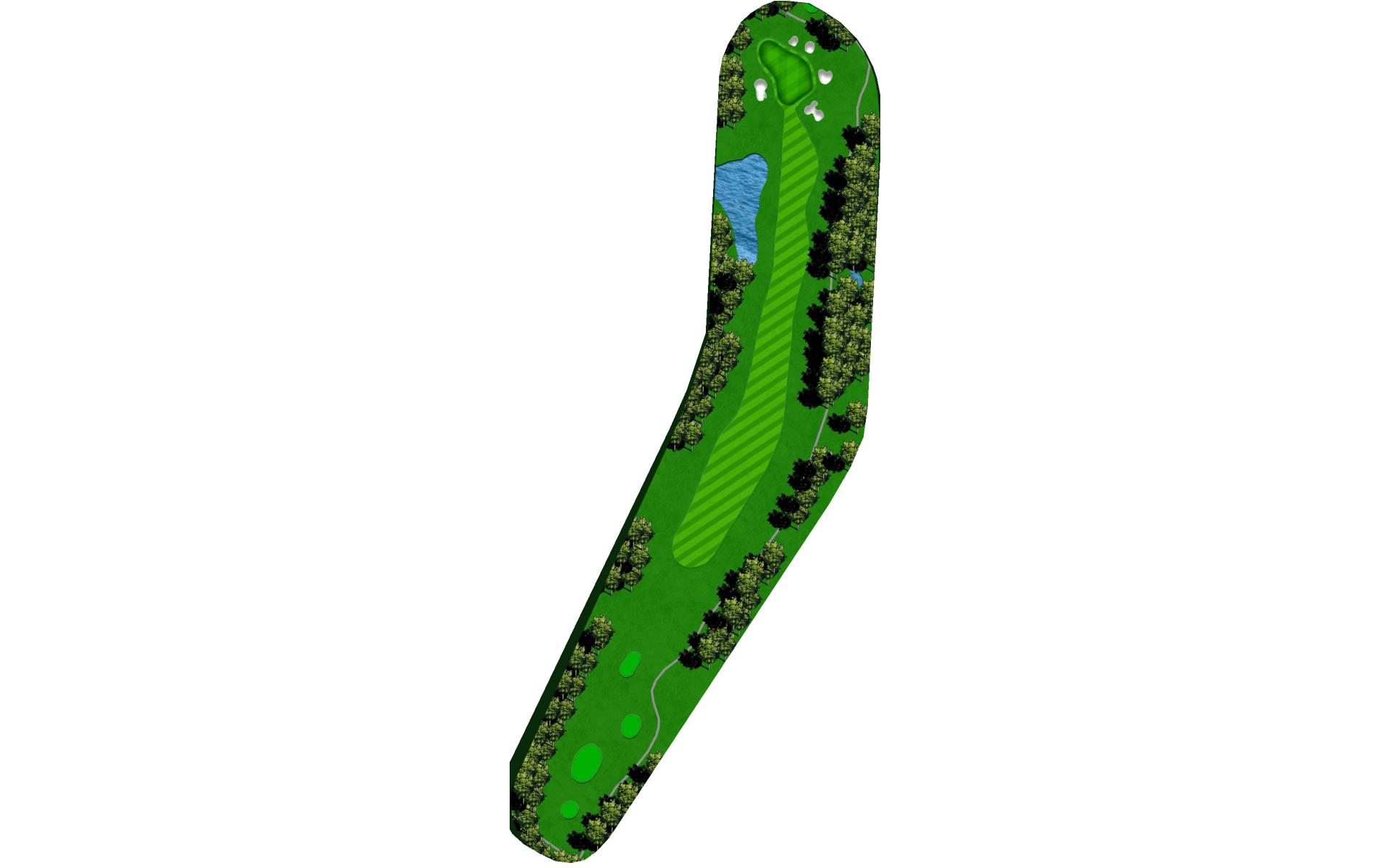 Downhill, dogleg left, par 4. Usually downwind, longer hitters should take a long iron or hybrid off the tee to set them up with a short to mid iron. Driver can reach the pond that starts about 100 yards away from the green. Shorter hitters may take a driver and leave them with a mid to long iron. Bunkers surrounding the green are tough up and downs from anywhere.