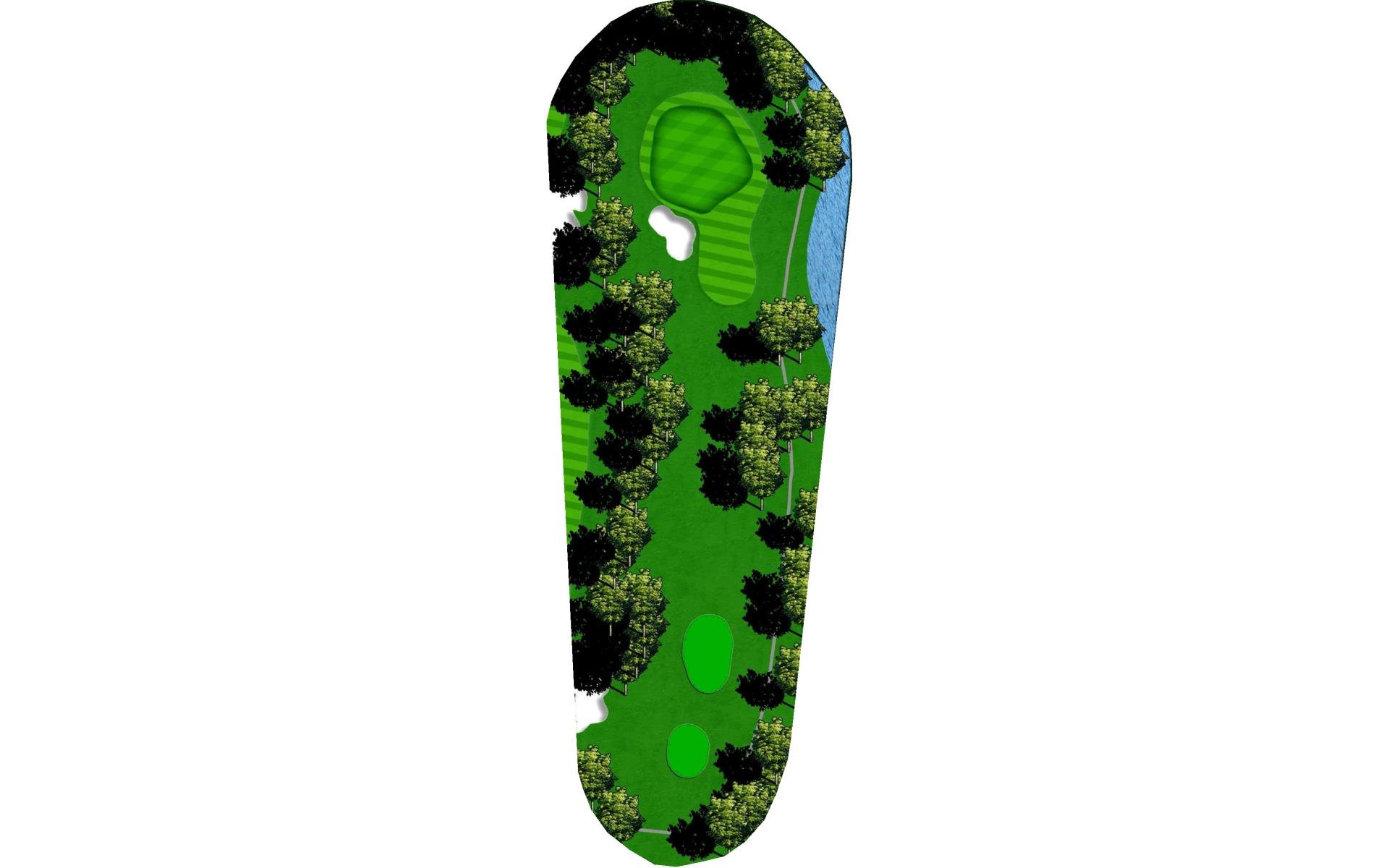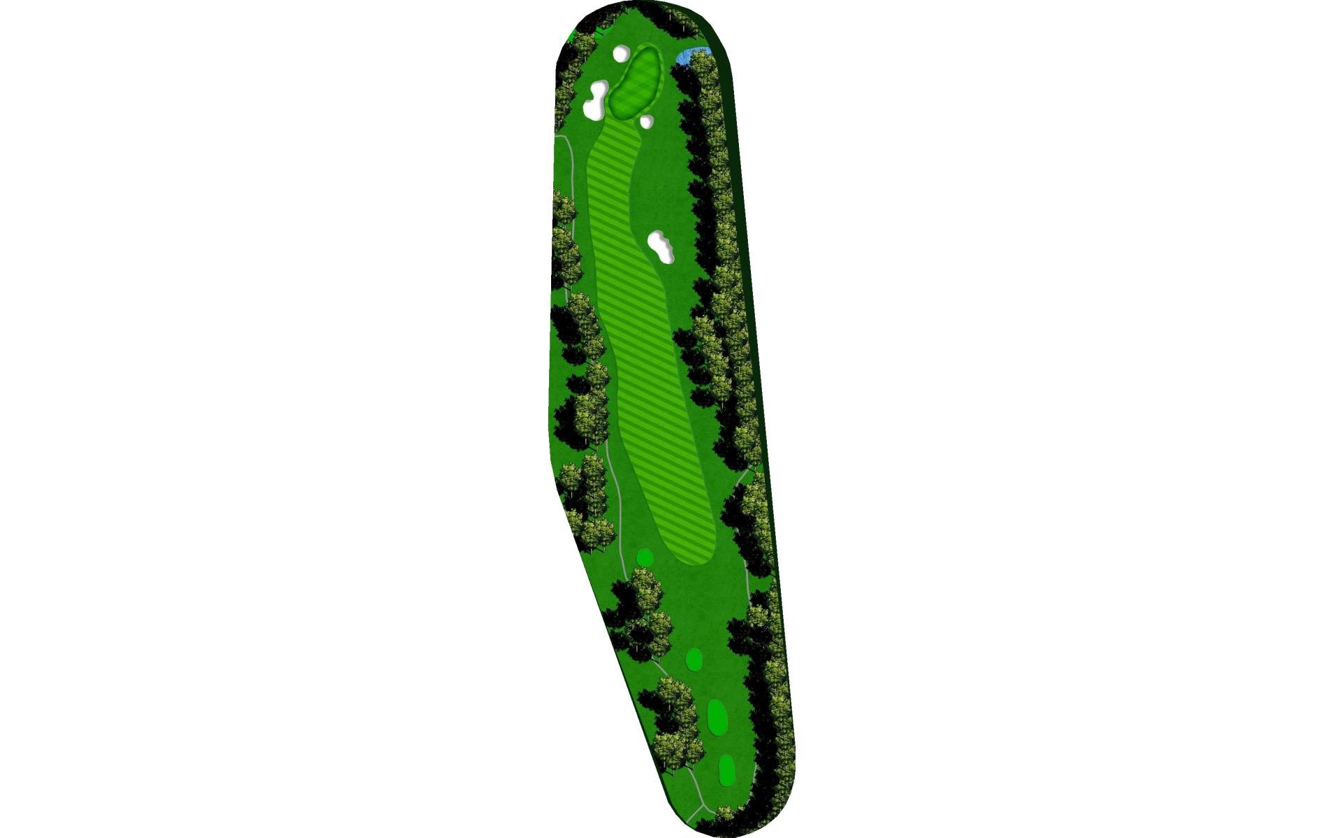 A shorter par 4 with bunkers on the left and water on the right. Any shot in the fairway will leave you with a good look at the green.