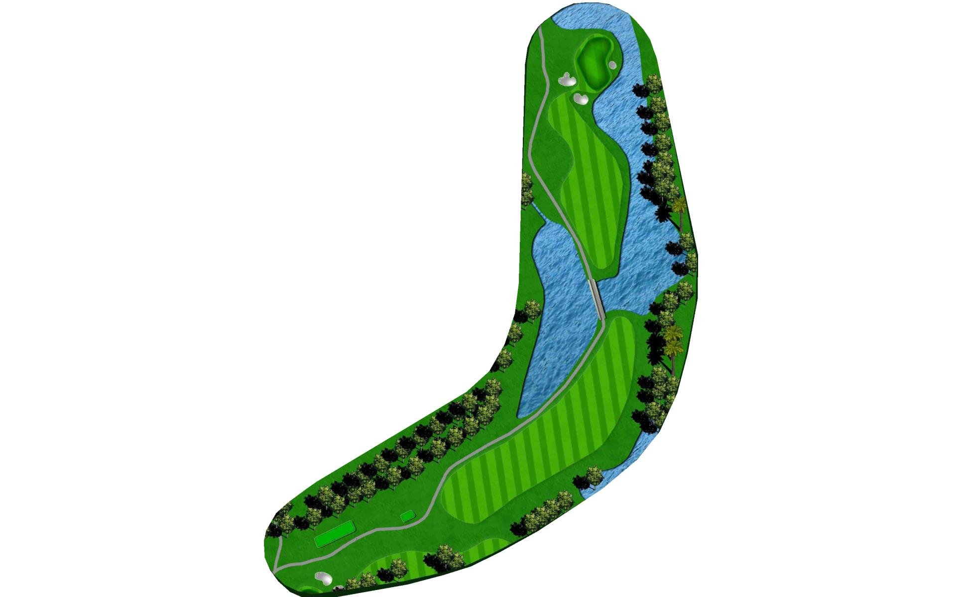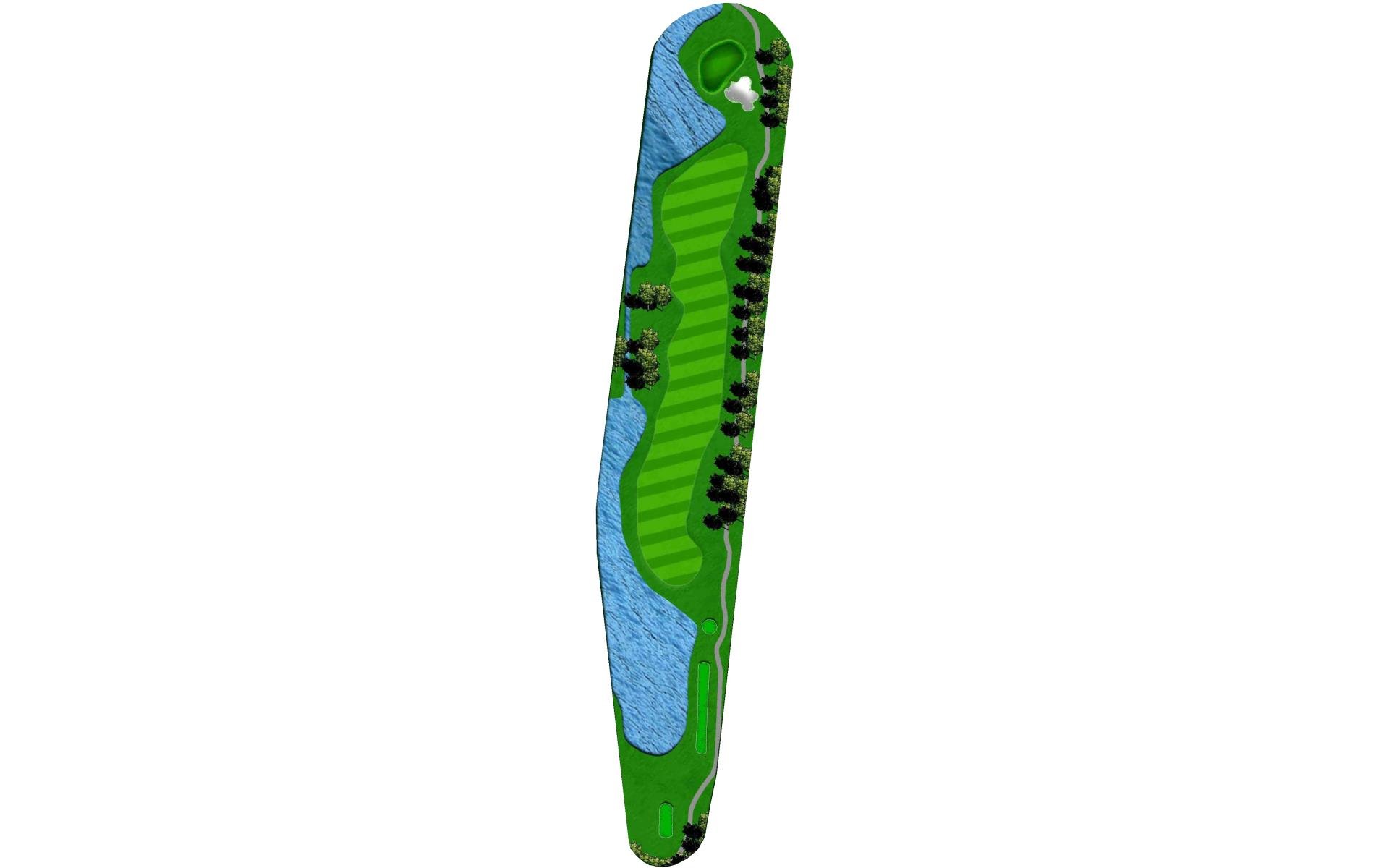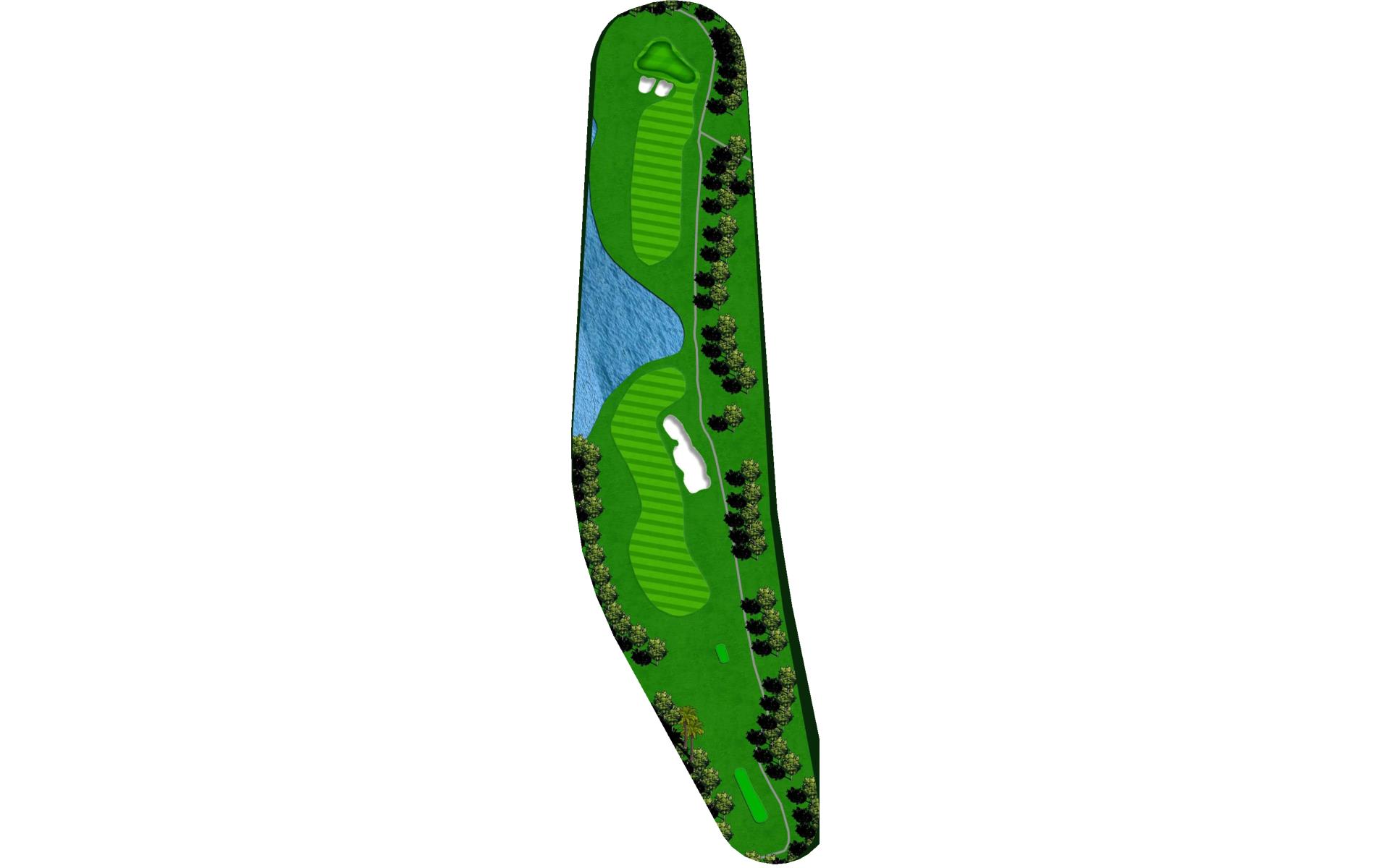 | The final par 5 on the course, "Temptation", is the most reachable. Water divides the fairway in half and some players need less than driver off the tee. Out-of-bounds running down the right side is certainty in play and greenside bunkers short of the green stop balls from rolling up if going for it in 2. |