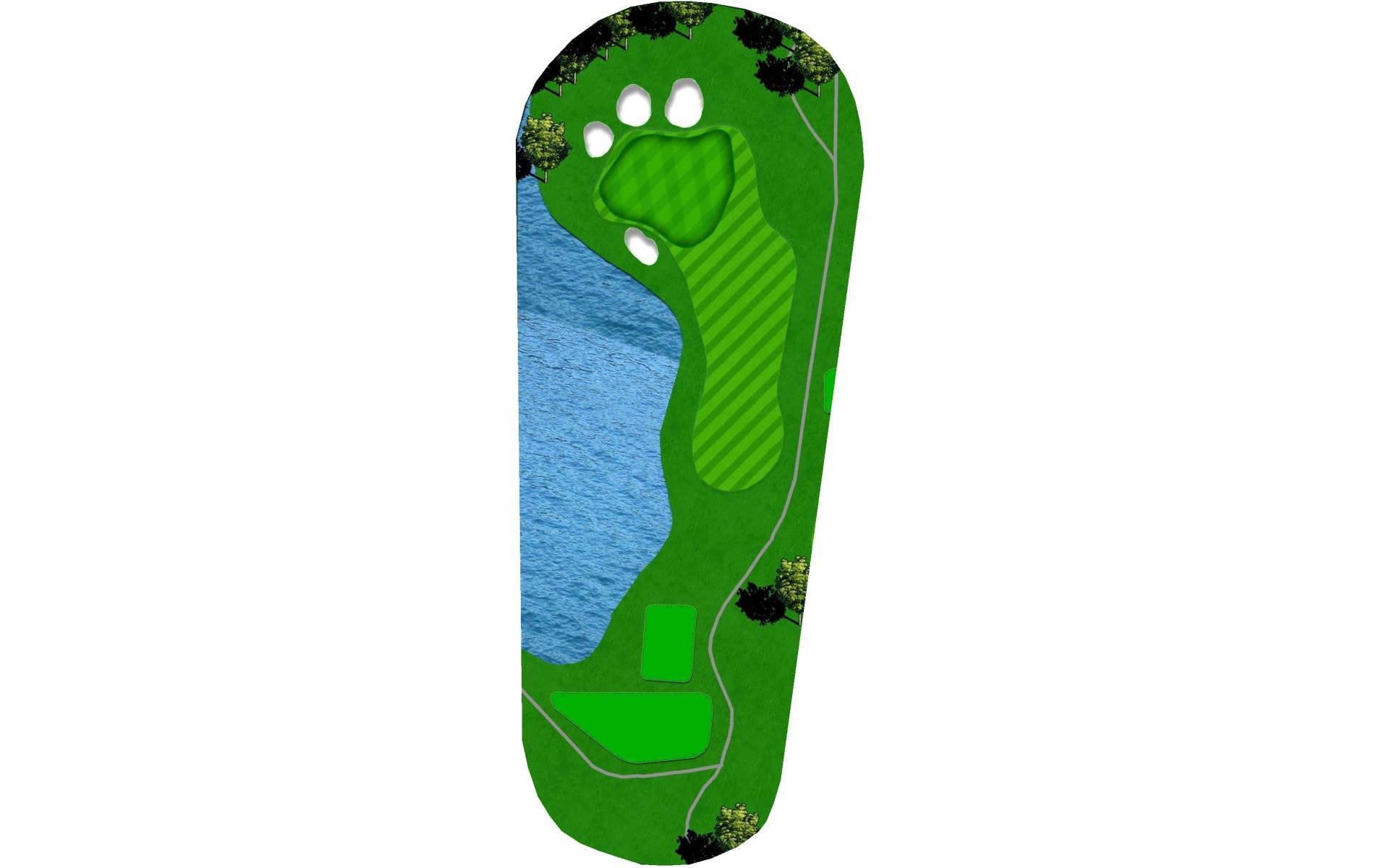 | "Bagpipes" is a long par 4 that sets up for a challenging finish. A good drive leaves a long approach into yet another peninsula green. Extreme undulation in the middle parts of the green make placement on the second shot paramount to success with the putter. |