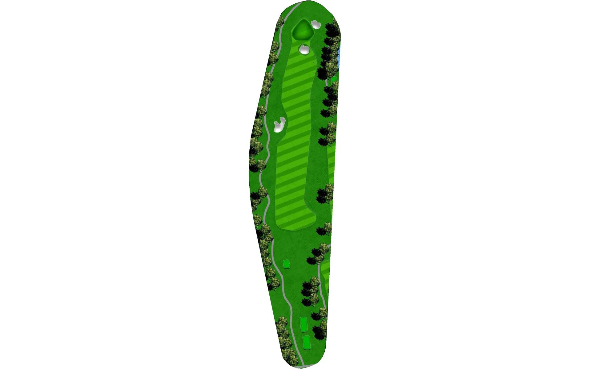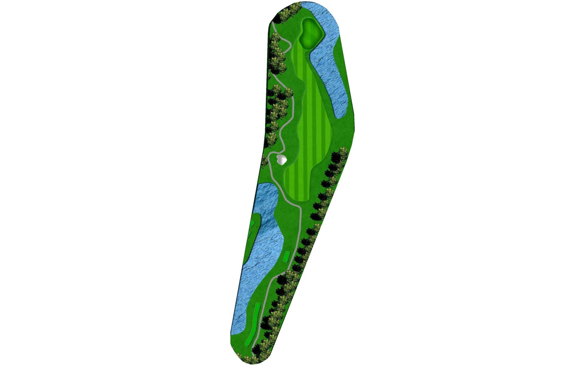 | "Eagle's Dare" is the only par 5 that does not force players to layup off the tee and is the longest hole on the golf course. Water surrounds this elevated two-tiered green on 3 sides, out-of-bounds runs down the other, and a large greenside bunker sits just short and to the right. Players should think carefully before taking it on. |