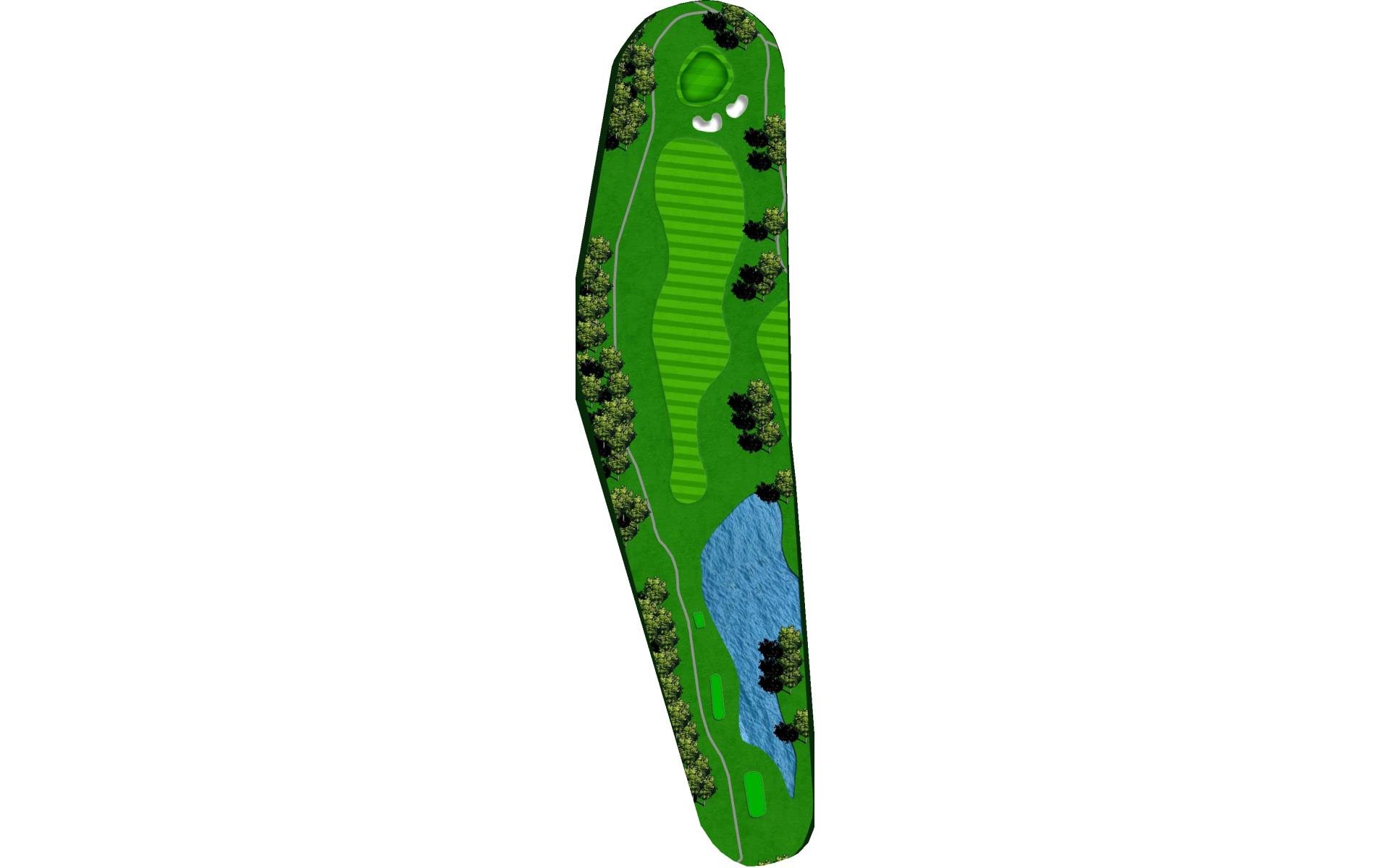 | With water down the right and out-of-bounds down the left, the first hole provides players with a formidable open tee shot. A raised green makes slightly off target approach shots require a good pitch shot to get up and down. |