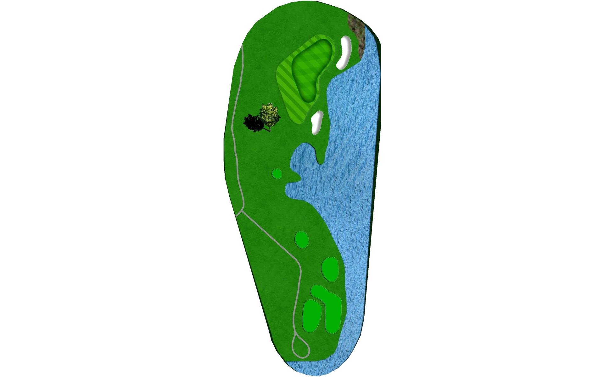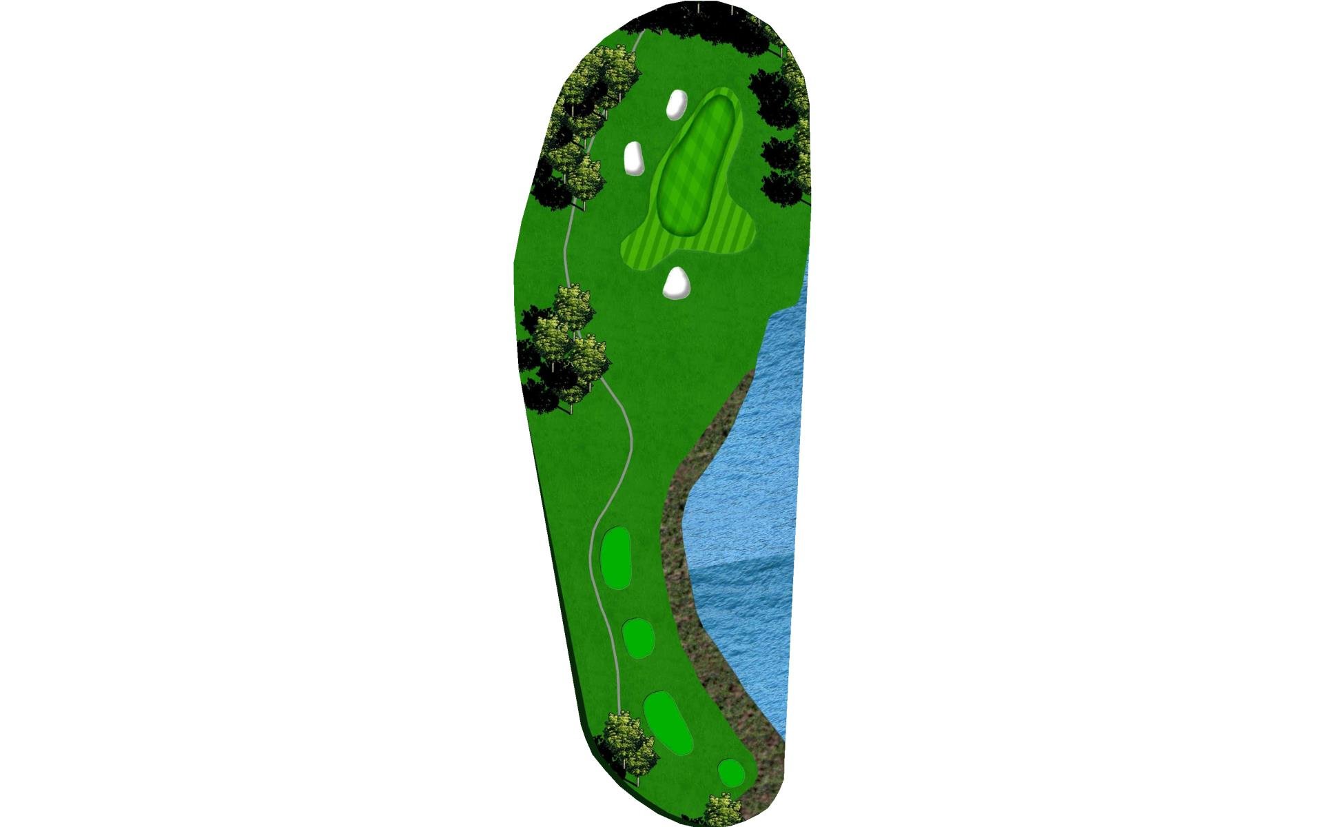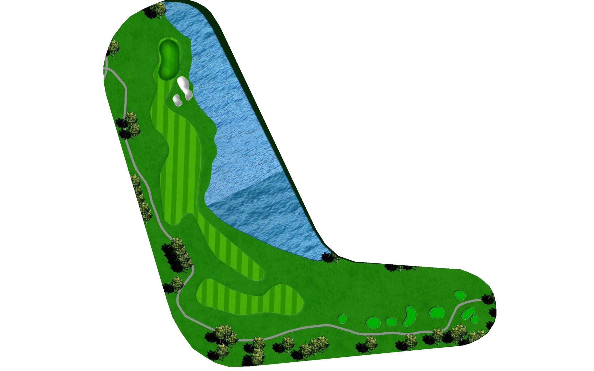 Nowhere to hide on this short Par 3. Water and bunkers right and a deep dropoff to the left make this hole a must for accuracy.