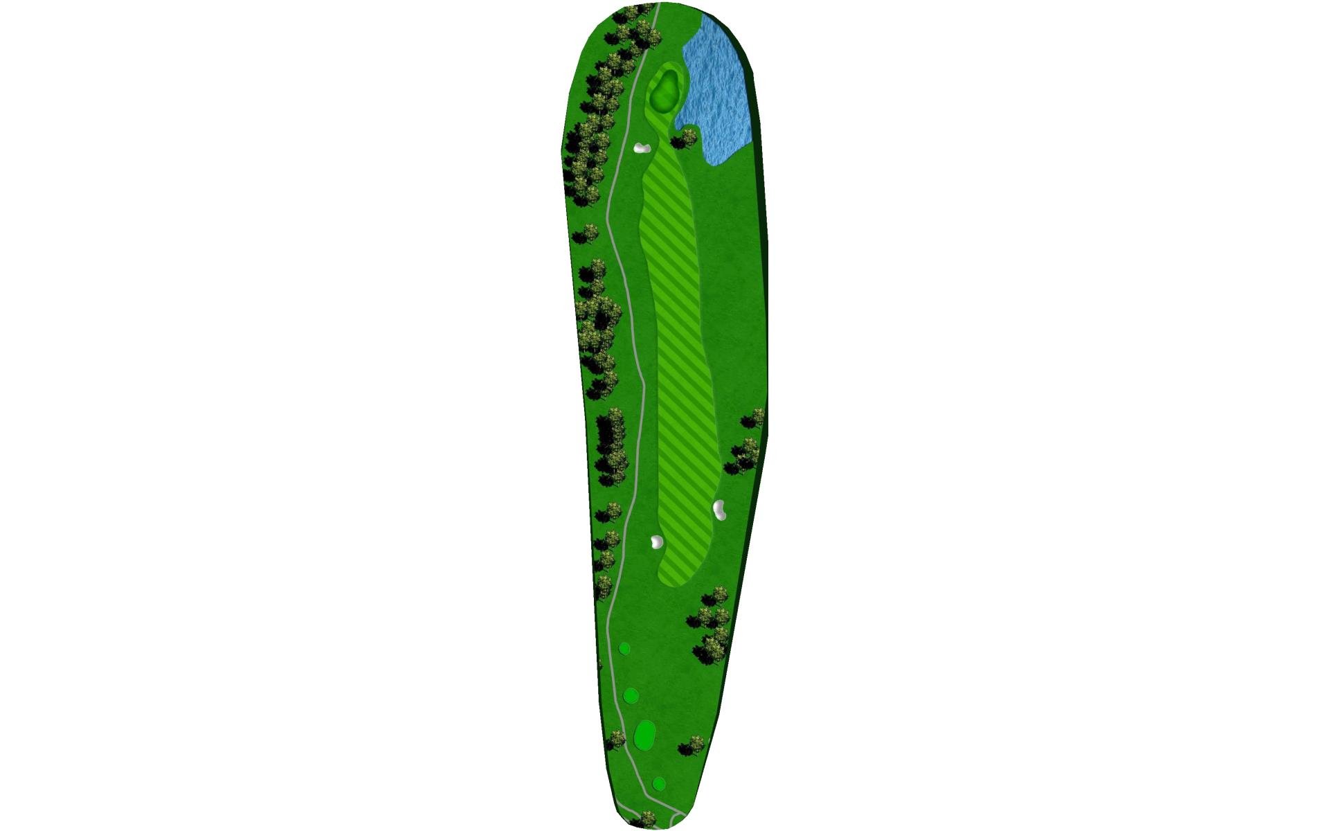 A great tee ball favors the left side of the fairway. Your second shot must be accurate and aim left center to avoid the penalty area on the right.