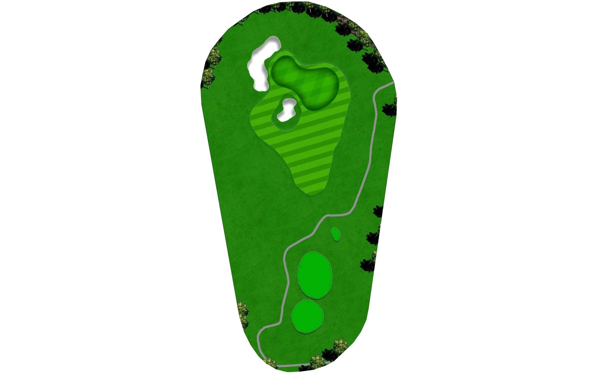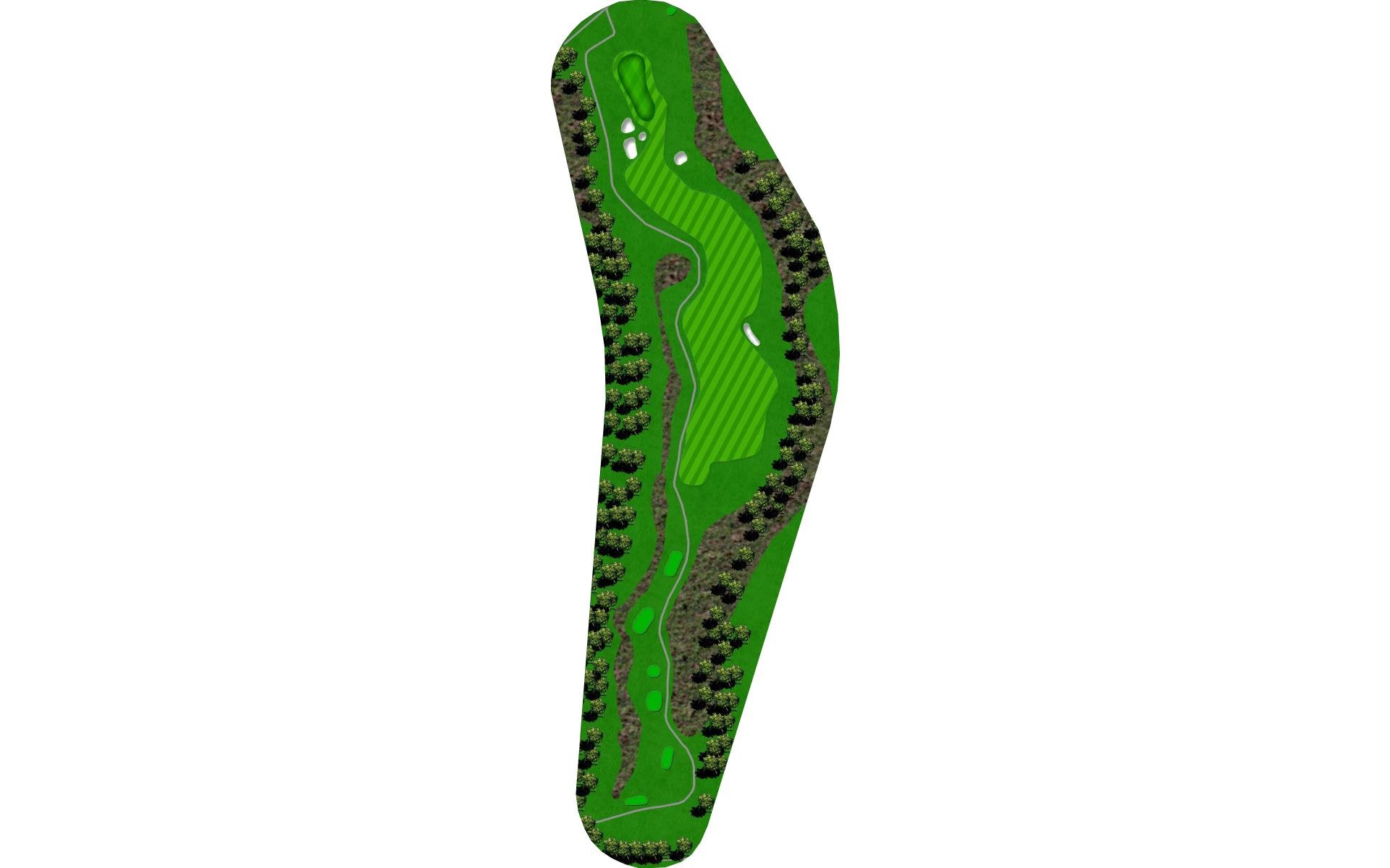 This is a great three shot double dogleg Par 5. The tee shot plays downhill and over a stream. The wide first landing area is still guarded by trees along both sides of the fairway and narrows as the hole turns left. The hole then turns to the right with a hillside along the right and penalty area left requiring a precise second shot for the final approach. The green is set at an angle with bunker short right and has a predominant slope from back right to front left of the green.